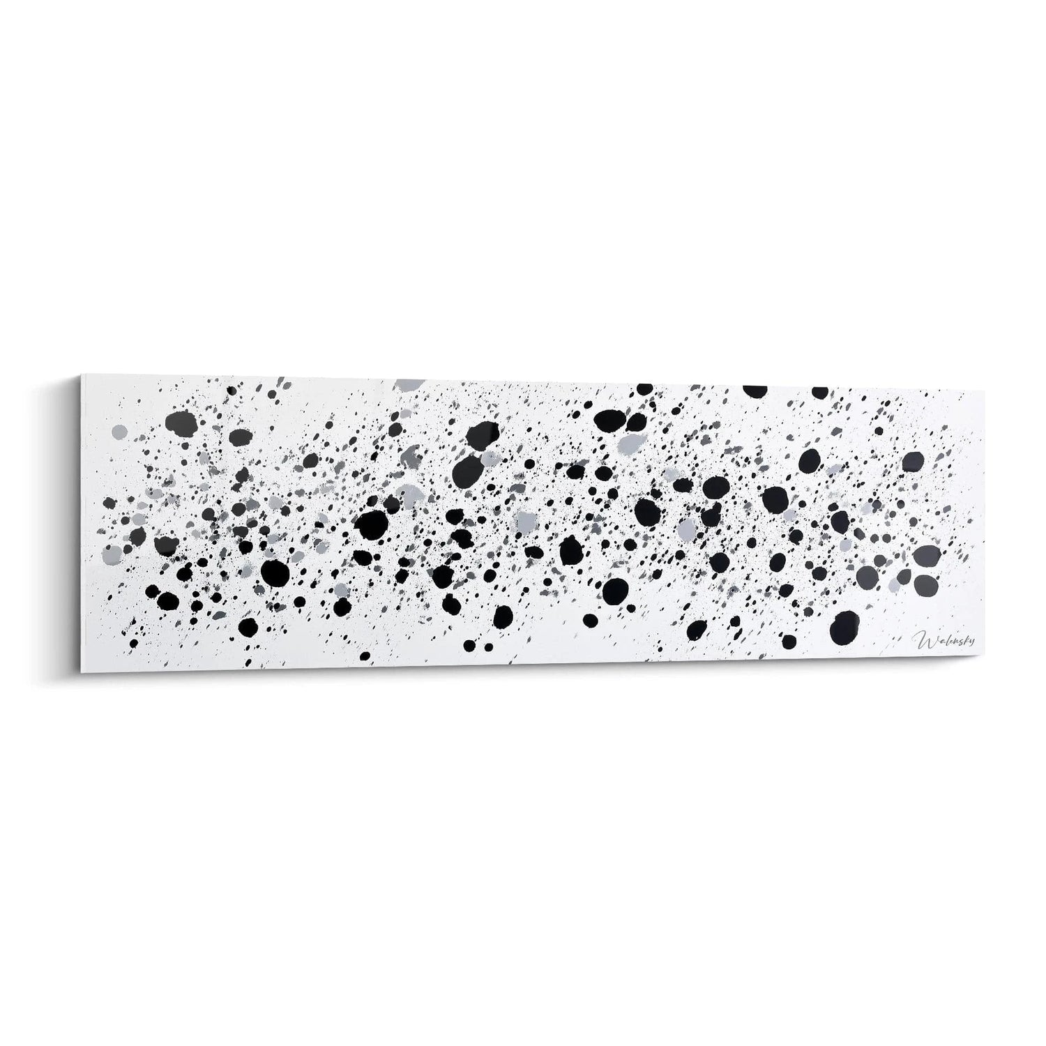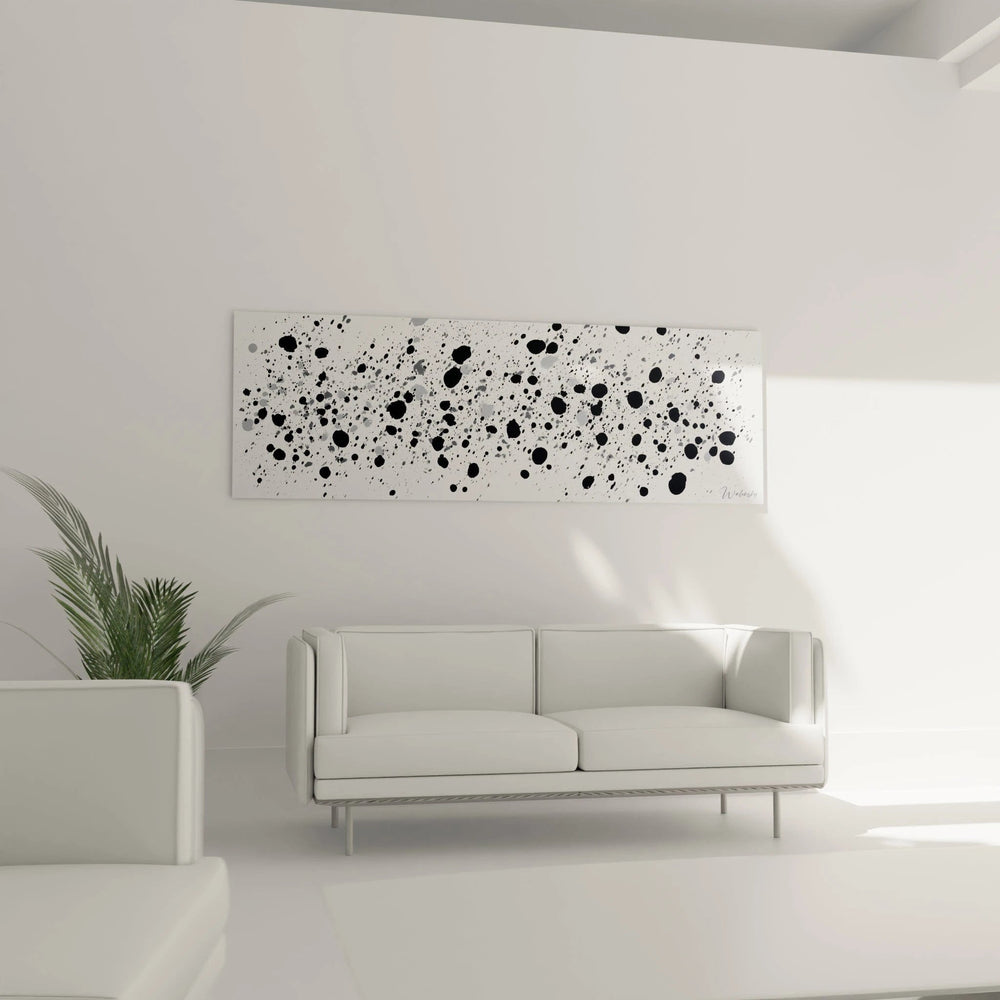 La composition s'organise autour d'une répartition équilibrée des éléments sur toute la surface. Les éclaboussures les plus importantes se concentrent vers le centre-gauche, créant un point focal naturel qui guide le regard. La perspective horizontale du format panoramique amplifie l'effet de mouvement et donne une sensation d'expansion. L'espace négatif blanc joue un rôle crucial en permettant aux taches de respirer et de créer des dialogues visuels entre elles. Cette décoration murale éclaboussures exploite intelligemment les proportions pour générer une dynamique visuelle qui transcende les limites du cadre.