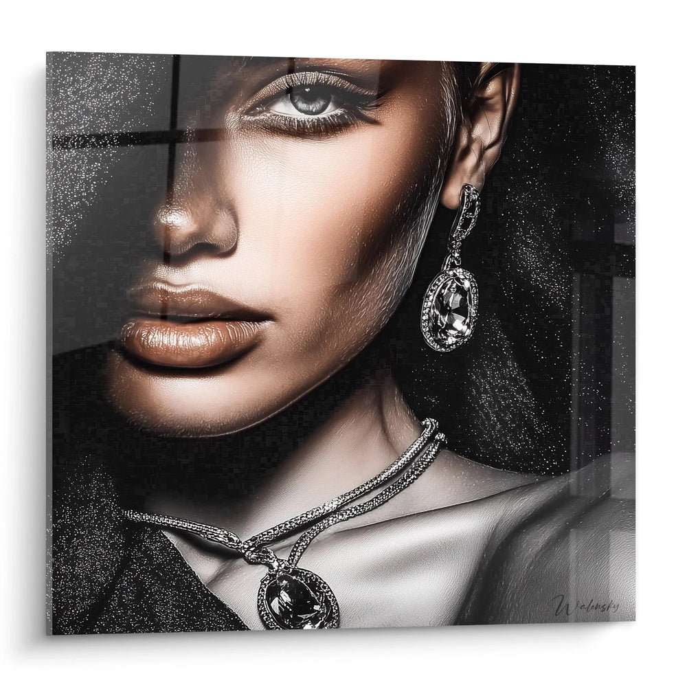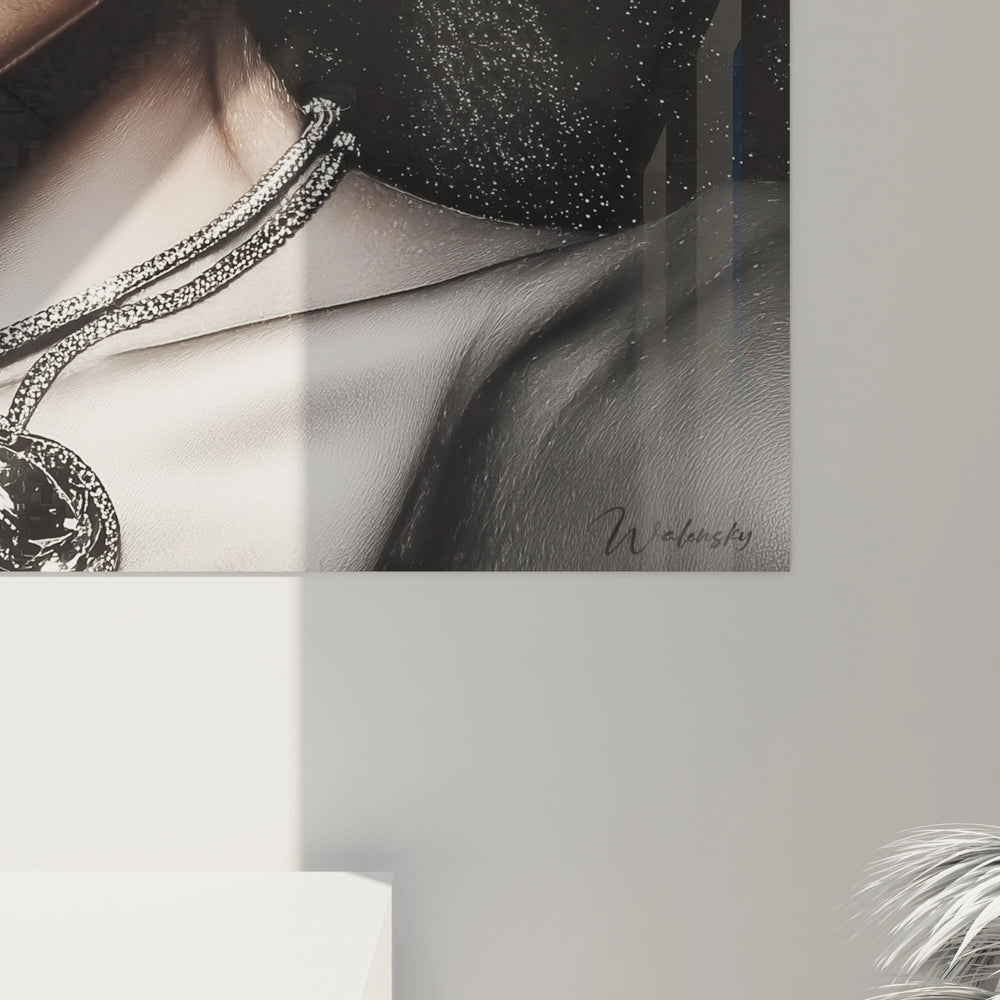 Cette œuvre s'inscrit dans la lignée des grands maîtres du portrait glamour, rappelant les créations de photographes comme Helmut Newton ou Guy Bourdin pour leur esthétique sophistiquée. On peut également y déceler des influences de l'hyperréalisme contemporain, mouvement artistique qui sublime la réalité par une technique picturale d'une précision extraordinaire. L'approche rappelle aussi les portraits de mode des années 1940-1950, période où l'élégance féminine et les accessoires bijoux tableau étaient magnifiés par un éclairage dramatique. Cette fusion entre photographie de mode et art mural contemporain femme place l'œuvre dans une catégorie artistique unique, alliant tradition portraitiste et modernité esthétique.