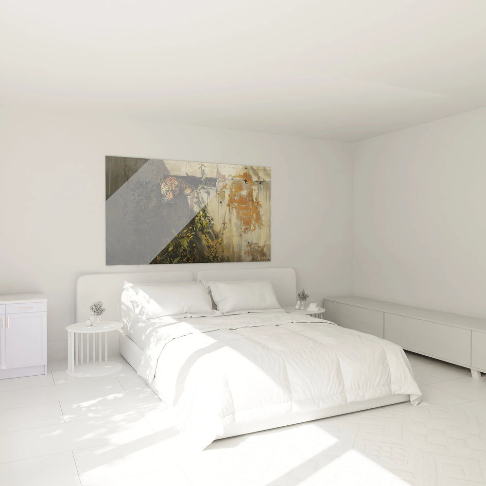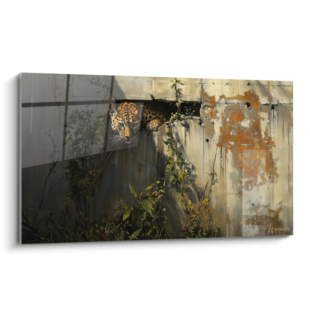 Les détails subtils comme les plantes grimpantes qui encadrent le félin renforcent cette narration visuelle d'une nature indomptable qui s'infiltre à travers les fissures de notre monde moderne. Cette décoration murale léopard transcende ainsi sa fonction esthétique pour devenir un commentaire puissant sur la coexistence fragile entre civilisation et nature sauvage.