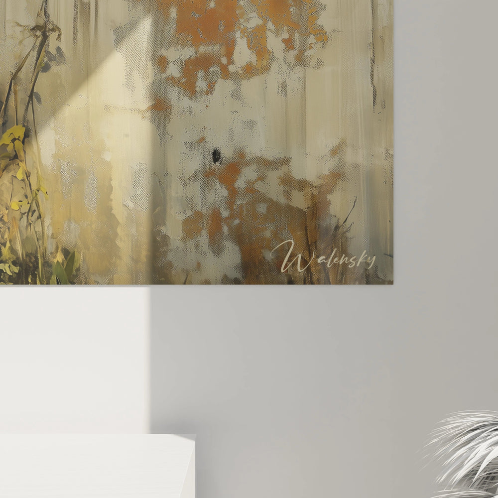 Ce tableau trouvera sa place idéale dans des espaces de vie contemporains où il pourra devenir le point focal d'une pièce. Un mur de couleur neutre - blanc cassé, gris clair ou même un bleu-gris très pâle - permettra à l'œuvre d'exprimer pleinement sa palette chromatique naturelle. Pour un impact maximal, privilégiez un mur dégagé où le tableau pourra être admiré sans éléments distractifs à proximité immédiate.