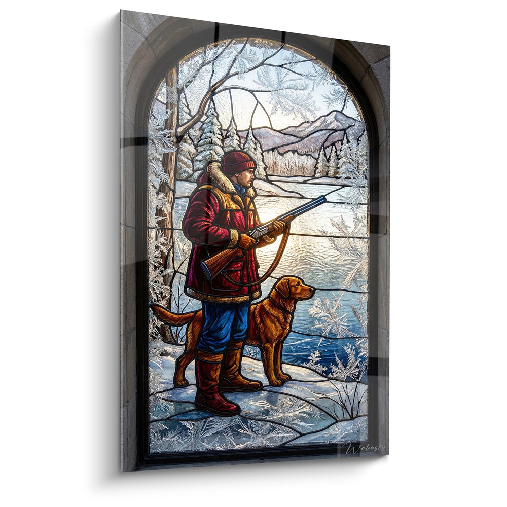 Cette œuvre d'art captivante représente un chasseur expérimenté accompagné de son fidèle compagnon canin dans un cadre hivernal enchanteur. L'homme, vêtu d'un manteau rouge bordeaux richement orné et d'un bonnet de laine, tient fermement son fusil de chasse, incarnant la tradition cynégétique ancestrale. Son chien de chasse, probablement un retriever au pelage roux, se tient fièrement à ses côtés, prêt pour l'action. La scène se déroule au bord d'un lac gelé, entouré d'une végétation hivernale délicatement givrée. L'archway de pierre qui encadre la composition ajoute une dimension architecturale noble, évoquant les grandes traditions de chasse européennes. Les arbres dénudés aux branches cristallines et les montagnes enneigées à l'arrière-plan créent une atmosphère authentique de chasse hivernale. Cette représentation artistique capture parfaitement l'essence de la chasse traditionnelle, mêlant respect de la nature, complicité homme-animal et beauté des paysages sauvages.