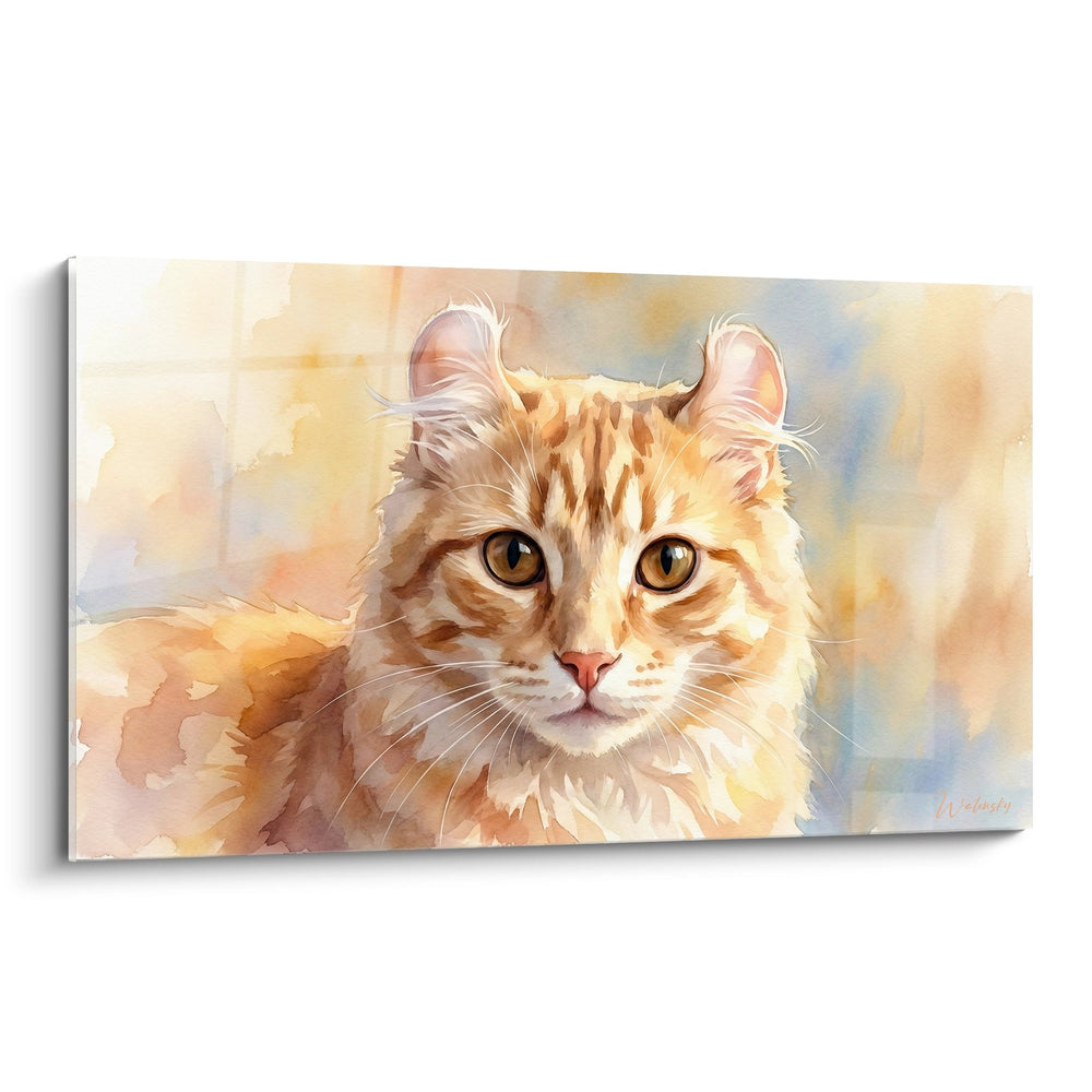 Ce tableau met en avant un chat American Curl avec un pelage doré dominant, agrémenté d'oreilles recourbées qui ajoutent une touche d'originalité. Les couleurs délicates du fond, allant du beige au pastel, créent un dégradé doux qui accentue les traits du félin. Les jeux de lumières subtilement intégrés offrent une profondeur visuelle, tandis que le style artistique aquarelle apporte une légèreté et une fluidité à l'ensemble.
