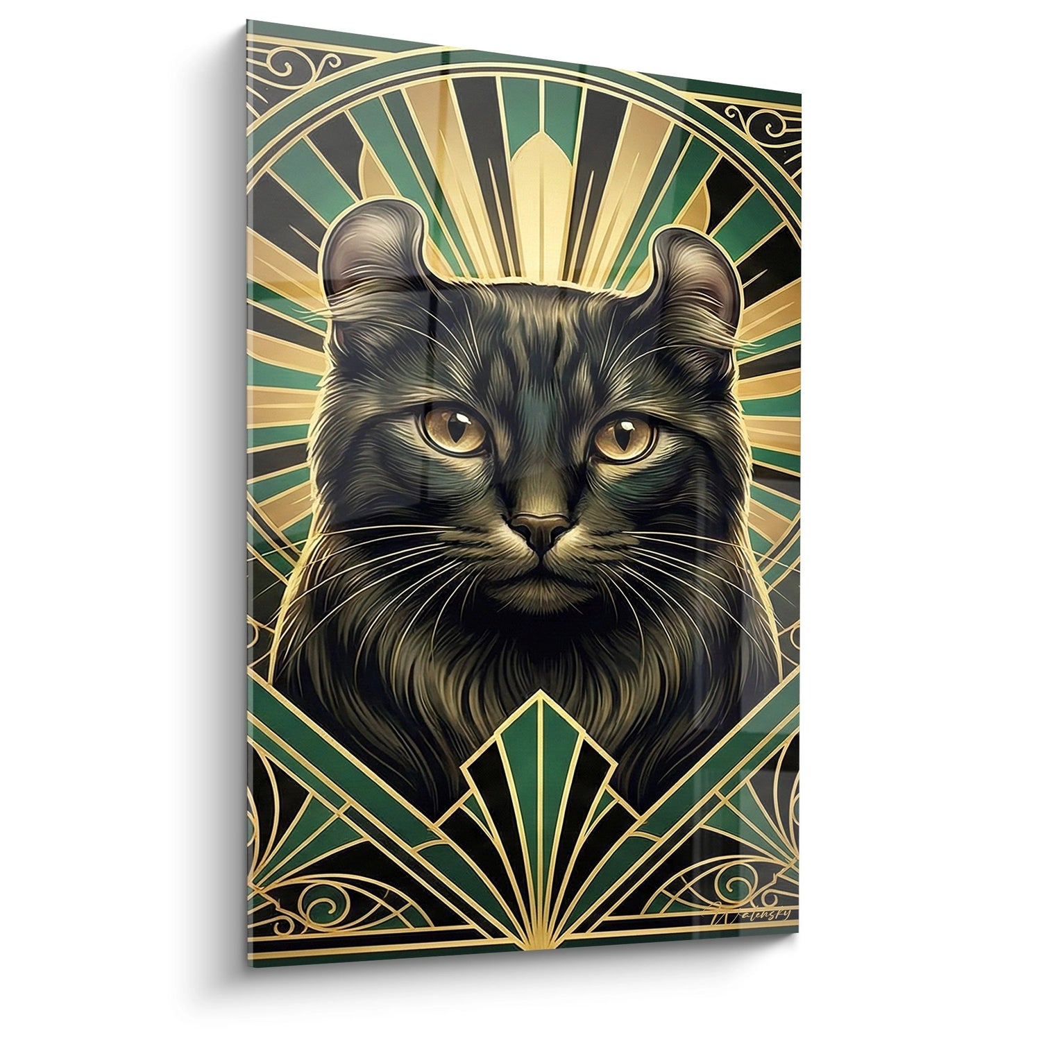 Ce tableau présente un chat American Curl avec de magnifiques yeux dorés, sur un fond géométrique aux nuances vertes et dorées. La composition joue habilement entre les nuances sombres et éclatantes, attirant le regard vers les détails du pelage. Le style artistique combine modernité et inspirations vintage, offrant ainsi un rendu visuel à la fois fascinant et distinctif.