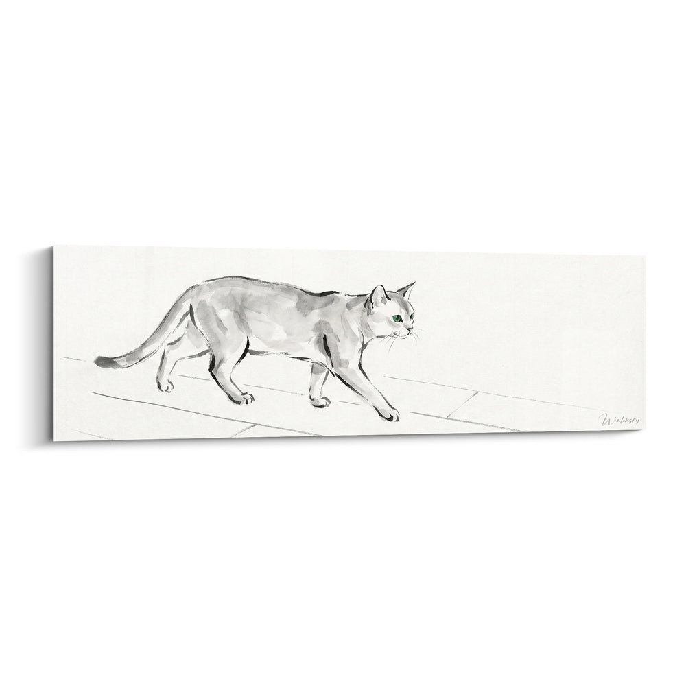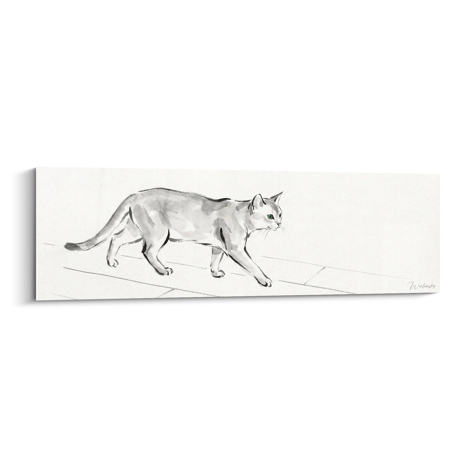 Ce superbe tableau mural capture avec élégance la grâce naturelle d'un chat en mouvement, peint dans des tonalités douces de gris et de blanc. L'artiste a su saisir l'essence même de la démarche féline, cette allure si particulière qui caractérise nos compagnons à quatre pattes. Le chat, représenté de profil, avance d'un pas sûr sur ce qui semble être un carrelage aux lignes géométriques subtiles. La technique picturale employée, probablement l'aquarelle ou la peinture à l'eau, confère à l'œuvre une douceur remarquable et une luminosité particulière. Les jeux d'ombres et de lumières soulignent parfaitement la musculature de l'animal et donnent une impression de mouvement saisissante. Cette représentation artistique s'inscrit parfaitement dans la tradition de l'art animalier contemporain, où la simplicité des formes rencontre la complexité des émotions. Le format panoramique de la toile accentue la sensation de déplacement et invite le regard à suivre la trajectoire du félin.