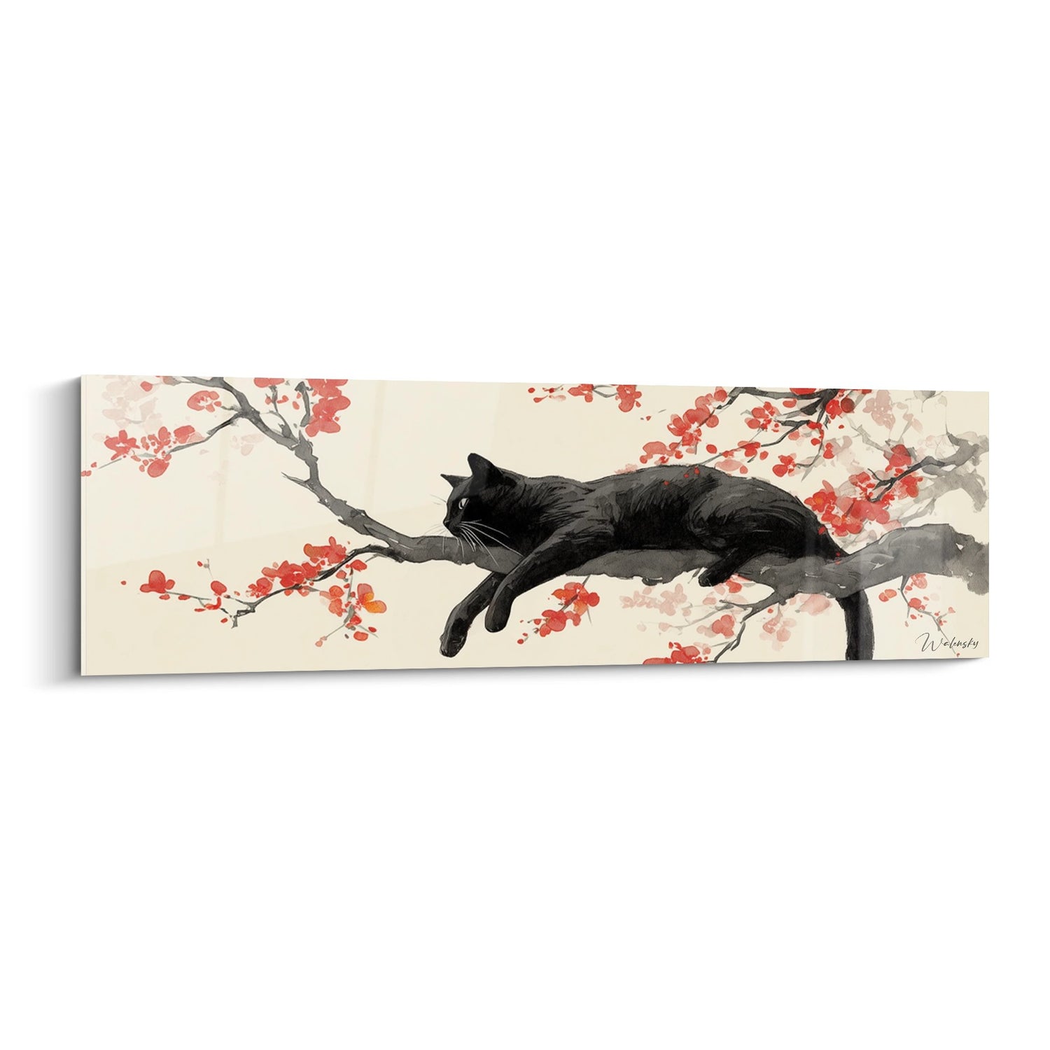 Tags: tableau chat noir, art japonais, fleurs cerisier, décoration zen, peinture féline