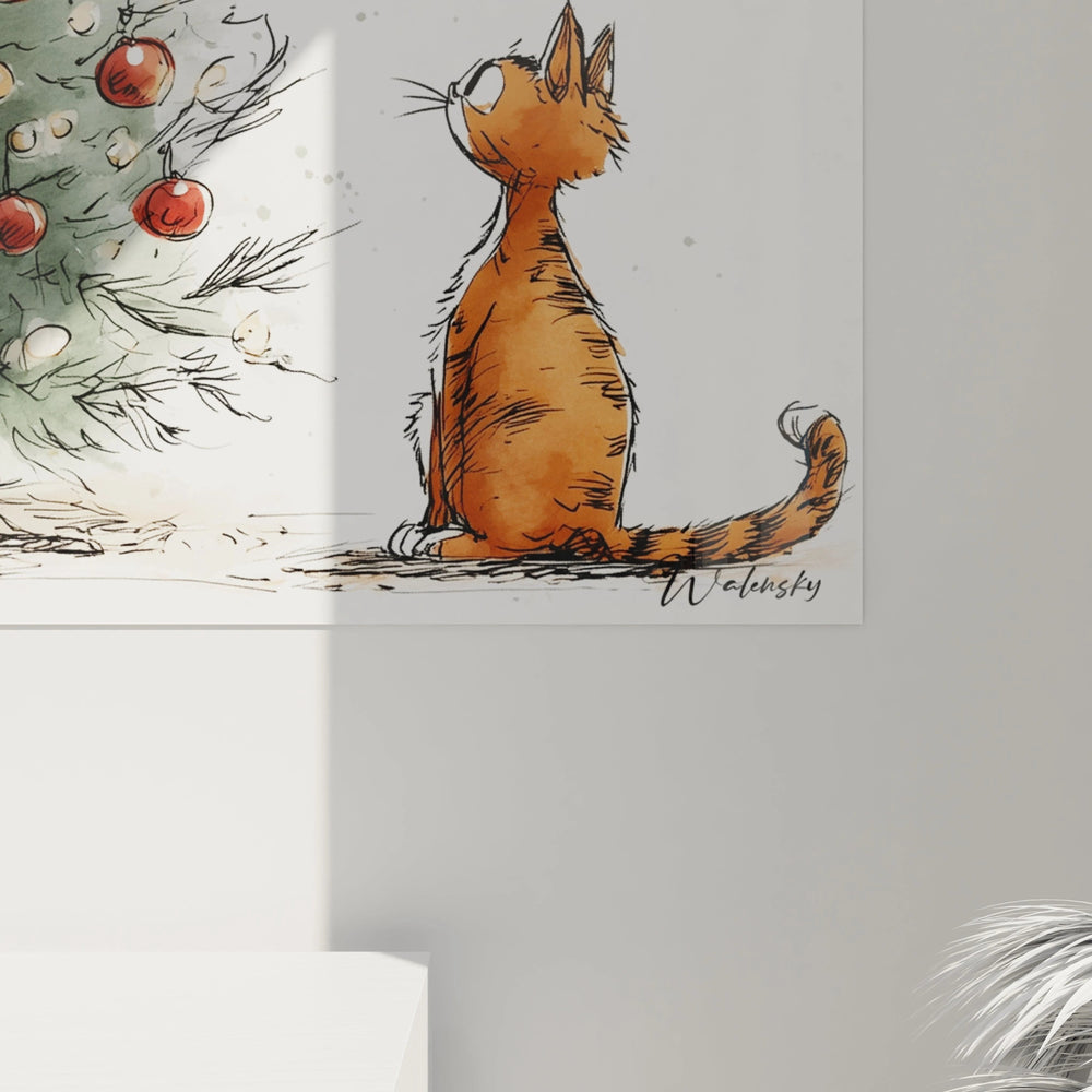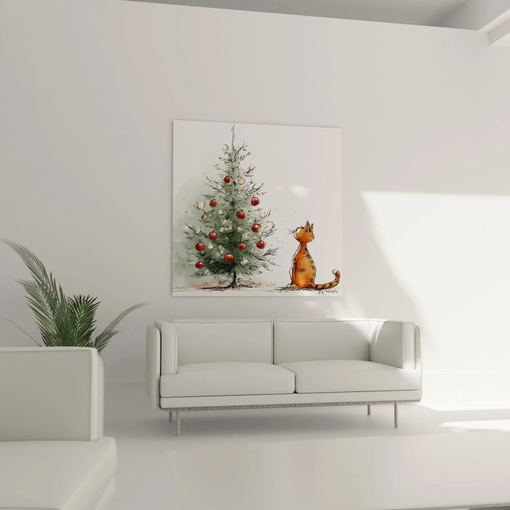 Cette œuvre d'art présente un tableau chat dans une composition touchante de Noël, où un félin roux contemple majestueusement un sapin décoré. Le tableau chat sapin de Noël capture un moment d'intimité hivernale avec une technique d'aquarelle délicate. L'animal au pelage orangé se tient en position assise, créant un contraste saisissant avec le vert profond de l'arbre festif. Les boules rouges et dorées du sapin apportent une dimension chaleureuse à cette décoration murale chat contemplative. Cette œuvre chat aquarelle révèle immédiatement sa singularité par l'expression paisible du félin et la délicatesse des traits artistiques.