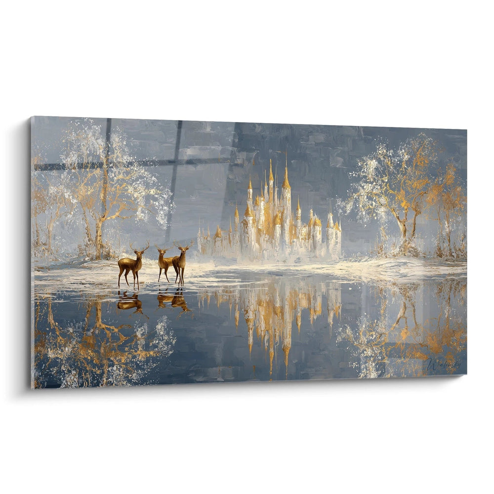 Ce magnifique tableau château fantastique présente une composition féerique dominée par un majestueux palais aux tours élancées se dressant au centre d'un paysage enneigé. L'œuvre capture instantanément l'attention par son atmosphère mystique où trois cerfs élégants se reflètent dans les eaux calmes d'un lac gelé. Le tableau château doré révèle une harmonie parfaite entre architecture fantastique et nature hivernale, créant une scène d'une beauté saisissante. Les reflets parfaits dans l'eau créent un effet de symétrie hypnotique qui double la splendeur de cette forteresse dorée.
