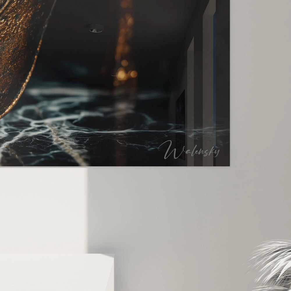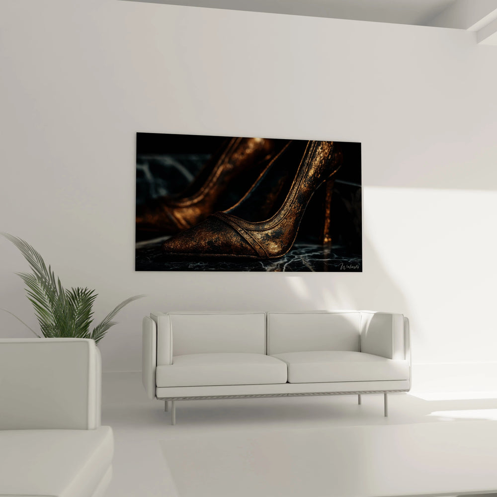 Cette œuvre d'art murale capture l'essence même de l'élégance masculine à travers une photographie artistique de chaussures cuir haut gamme. Le tableau mural chaussures met en scène des chaussures de ville aux finitions bronze-dorées, sublimées par un éclairage dramatique qui révèle chaque détail de leur construction artisanale. La texture du cuir patiné raconte une histoire de savoir-faire traditionnel, où chaque pli et chaque grain témoignent de la qualité exceptionnelle du matériau. L'artiste a su capter la lumière de manière à créer des reflets dorés qui transforment ces accessoires du quotidien en véritables objets d'art. Le contraste saisissant entre les zones d'ombre profondes et les éclats lumineux confère à l'ensemble une dimension sculpturale remarquable. Le sol en marbre veiné apporte une note de sophistication supplémentaire, évoquant les plus beaux intérieurs contemporains. Cette décoration murale masculine transcende la simple photographie de produit pour devenir une célébration visuelle du raffinement style masculin. L'approche artistique révèle la beauté cachée dans les objets du quotidien, transformant ces chaussures en symboles de prestige maroquinerie luxe et d'excellence.