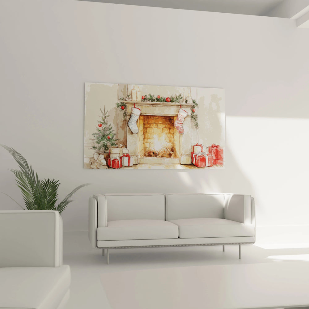 Ce tableau cheminée capture l'essence même des fêtes de fin d'année avec une composition d'intérieur intimiste et chaleureuse. L'œuvre présente un foyer central en pierre ocre où dansent des flammes dorées, créant une atmosphère réconfortante typique des soirées hivernales. Le tableau cheminée décorée révèle immédiatement son caractère festif grâce aux guirlandes de sapin ornées de boules rouges qui encadrent le manteau. Cette scène domestique baignée de lumière naturelle évoque parfaitement l'art de vivre à l'approche des célébrations, transformant un simple foyer en véritable sanctuaire familial décoré avec soin.