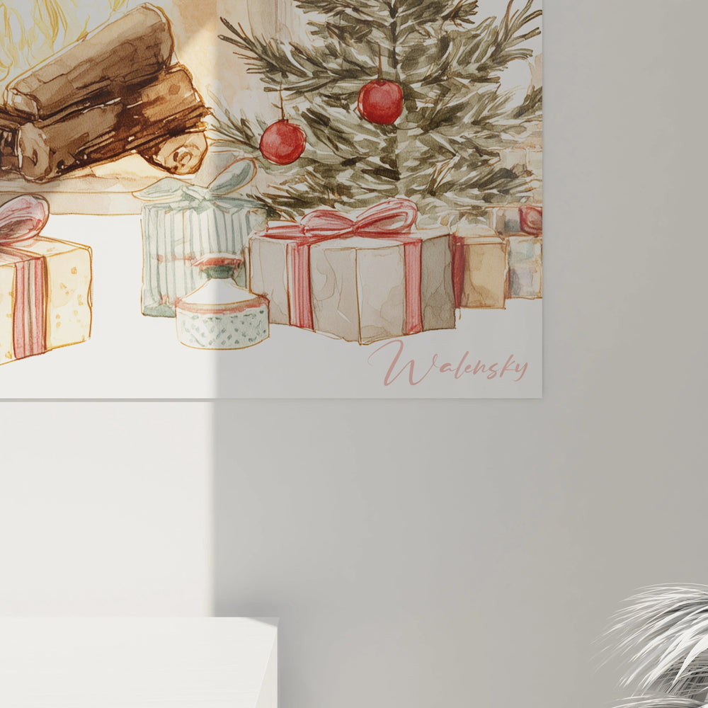 L'observation rapprochée de ce tableau cheminée atmosphérique révèle une richesse de détails insoupçonnés. Les motifs tricotés des chaussettes montrent une précision remarquable, avec des jeux d'ombres et de lumières qui donnent du volume aux fibres. À distance, l'effet global crée une ambiance chaleureuse et accueillante, tandis que l'examen de près dévoile la sophistication technique de l'aquarelle. Cette décoration murale cheminée hiver change d'aspect selon l'angle de vue, les reflets des bougies semblant danser différemment selon la perspective d'observation.