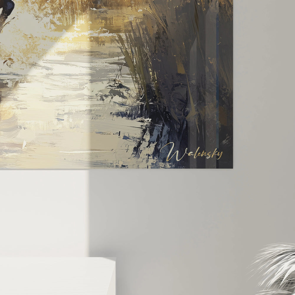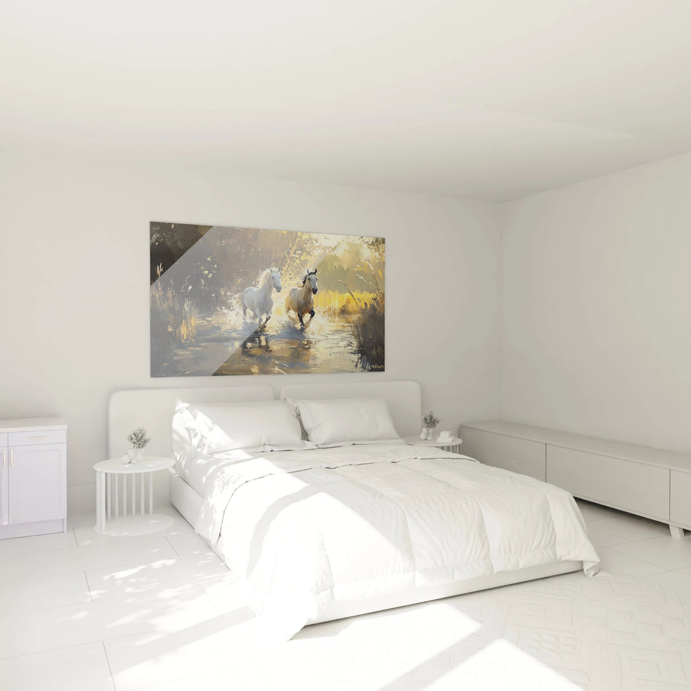 Ce tableau cheval présente une scène dynamique et captivante où deux magnifiques équidés blancs galopent à travers une étendue d'eau peu profonde. L'œuvre se distingue par sa palette chromatique chaleureuse dominée par des tons dorés et ocres qui créent une atmosphère lumineuse et énergique. Les éclaboussures d'eau cristalline contrastent brillamment avec la robe claire des chevaux, tandis que l'arrière-plan révèle une végétation automnale aux nuances ambrées. Ce tableau cheval galop aquatique capture parfaitement l'essence de la liberté et du mouvement naturel, offrant une composition équilibrée qui attire immédiatement le regard vers le centre de l'action.