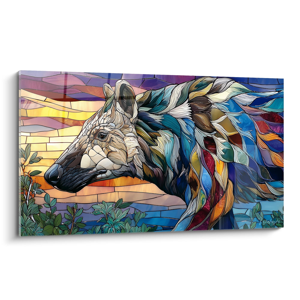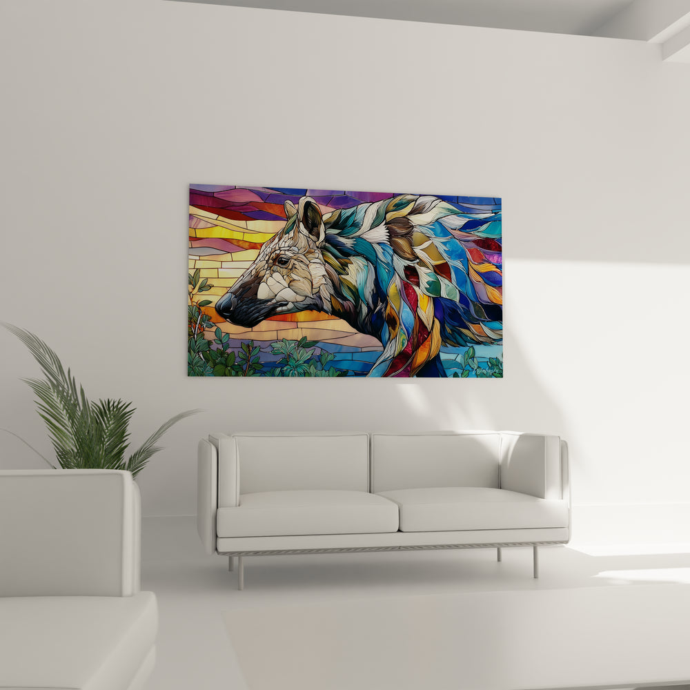 Ce tableau mural Andrewsarchus présente une œuvre d'art extraordinaire où la majesté équine rencontre l'art de la mosaïque colorée. L'animal est représenté de profil, révélant une anatomie détaillée où chaque segment évoque les tesselles d'un vitrail ancien. La crinière du Andrewsarchus se déploie en un festival de couleurs, mélangeant harmonieusement les bleus profonds, les verts émeraude, les rouges carmin et les dorés chatoyants. Cette décoration murale équestre transforme l'animal en véritable kaléidoscope vivant, où chaque mèche de crin devient un pinceau trempé dans l'arc-en-ciel. Le fond du tableau décoratif cheval s'organise en bandes géométriques aux teintes pastel, créant un effet de coucher de soleil stylisé qui met en valeur la silhouette de l'animal. Les détails anatomiques sont traités avec une précision remarquable, depuis l'œil expressif jusqu'aux naseaux finement dessinés. Cette œuvre d'art Andrewsarchus moderne capture l'essence sauvage et libre du cheval tout en l'habillant d'une esthétique contemporaine. La technique utilisée évoque les maîtres verriers tout en conservant une approche résolument moderne de l'art animalier décoratif.