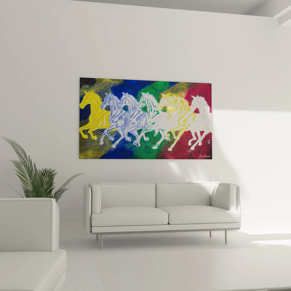 Ce tableau chevaux présente une composition saisissante de six équidés en mouvement sur un fond de lignes ondulantes colorées. L'œuvre capture l'essence du dynamisme équestre à travers une approche contemporaine unique. Les chevaux se détachent avec une élégance remarquable, chacun dans une teinte différente qui dialogue harmonieusement avec son arrière-plan respectif. Cette décoration murale chevaux galop offre une interprétation moderne du mouvement animal, où les formes stylisées créent un effet visuel captivant. L'artiste Walesky a su créer une œuvre où la répétition rythmée des silhouettes équines génère une sensation de course perpétuelle, transformant cette œuvre chevaux colorés en véritable hymne au mouvement.