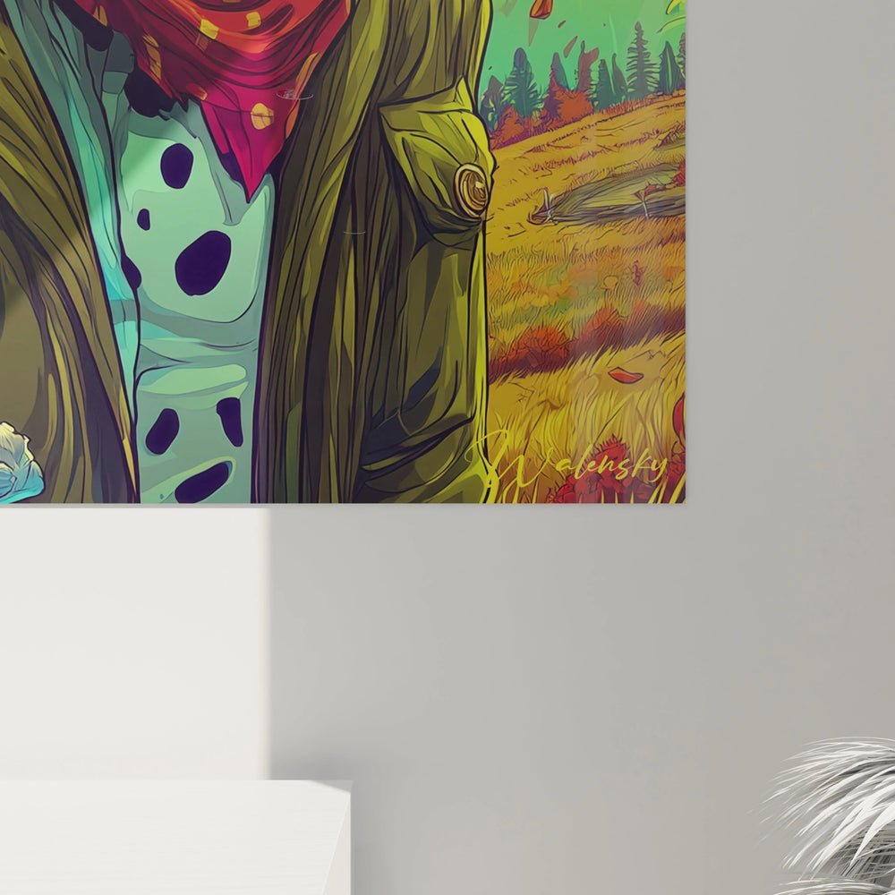 Ce tableau mural chien fantastique présente une œuvre saisissante mêlant réalisme animal et imaginaire fantastique. L'artiste a créé un portrait de chien humanisé doté de cornes majestueuses et portant des lunettes rondes dorées, lui conférant un aspect à la fois mystique et intellectuel. Le personnage canin arbore une veste militaire vintage de couleur olive ornée de boutons dorés et d'un foulard rouge écarlate qui apporte une touche de sophistication à l'ensemble. Cette illustration bande dessinée chien se détache sur un arrière-plan aux nuances turquoise et émeraude, créant un contraste saisissant avec les tons chauds du personnage. Les cornes de cerf stylisées ajoutent une dimension mythologique à ce art mural fantastique, évoquant les créatures des légendes nordiques. Le style graphique rappelle les meilleures productions de bande dessinée moderne, avec ses traits nets, ses ombrages maîtrisés et sa palette chromatique audacieuse. Ce tableau décoratif chien anthropomorphe transforme l'animal domestique en guide spirituel ou en sage gardien des forêts, créant une narration visuelle captivante qui interpelle le spectateur et l'invite à imaginer les aventures de ce personnage hors du commun.