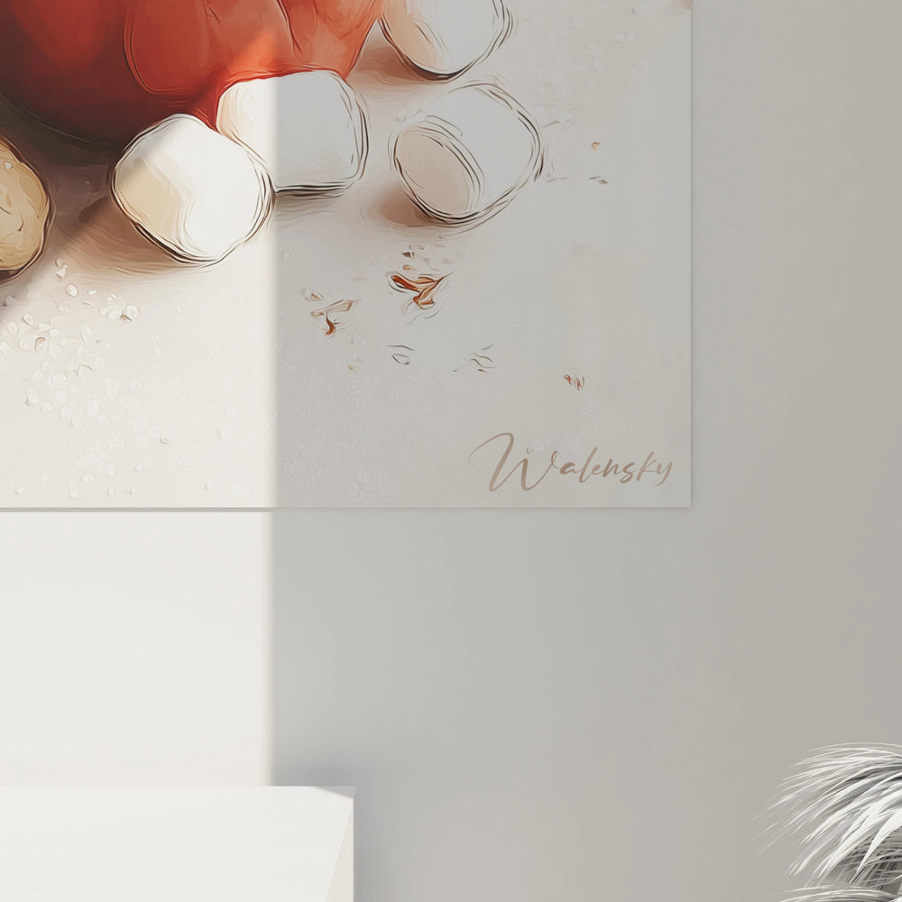 L'originalité de ce tableau chocolat chaud contemporain réside dans sa capacité à transformer un moment quotidien en une célébration visuelle extraordinaire. L'intégration des branches ornementales directement dans la tasse constitue un élément distinctif remarquable, créant une fusion poétique entre nature et artifice. Cette art mural chocolat chaud se distingue également par son traitement lumineux particulier, où les particules en suspension créent une atmosphère quasi magique. Les détails comme les biscuits aux graines de sésame et les marshmallows éparpillés apportent une authenticité touchante qui élève cette représentation au-delà de la simple nature morte pour en faire une véritable ode aux plaisirs simples.