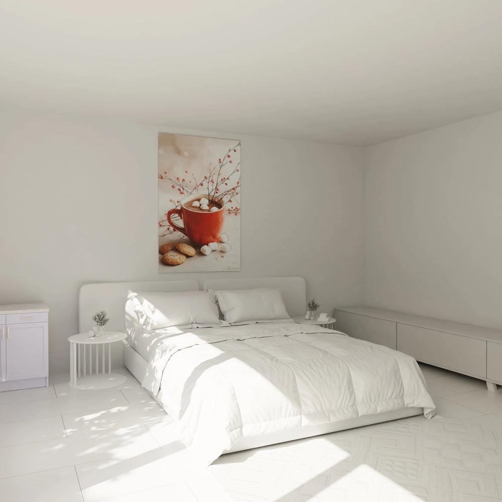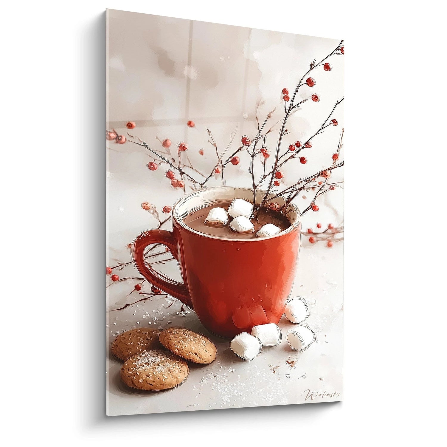 Cette œuvre chocolat chaud dévoile une scène d'une intimité saisissante, où une tasse rouge vermillon trône majestueusement au centre de la composition. Le tableau chocolat chaud aux guimauves capture l'essence même du réconfort hivernal à travers ses détails minutieusement orchestrés. Les marshmallows blancs flottent délicatement à la surface du breuvage fumant, créant un contraste saisissant avec la richesse chocolatée du liquide. Des branches aux baies rouges émergent gracieusement de la tasse, transformant cette simple boisson en un bouquet festif extraordinaire. L'ensemble dégage une atmosphère de chaleur authentique qui transcende la simple représentation pour devenir une véritable invitation sensorielle.