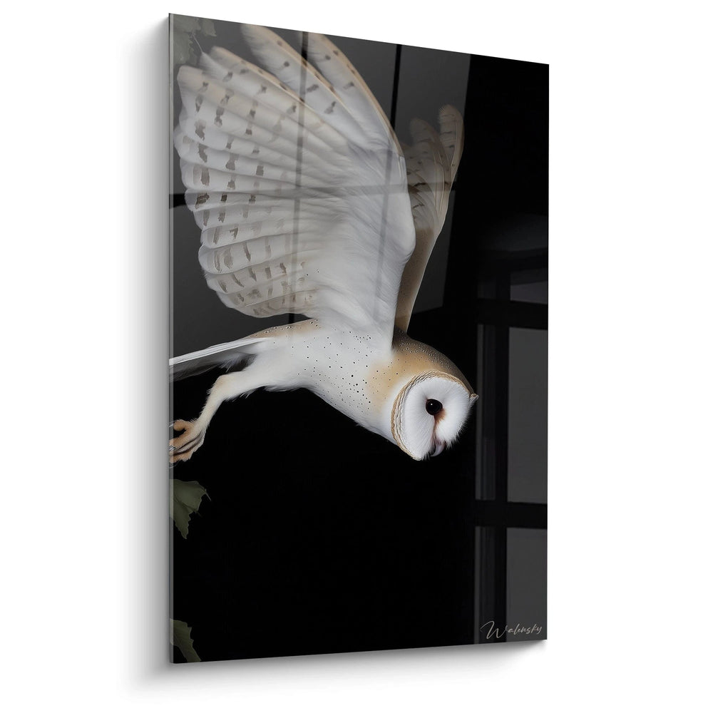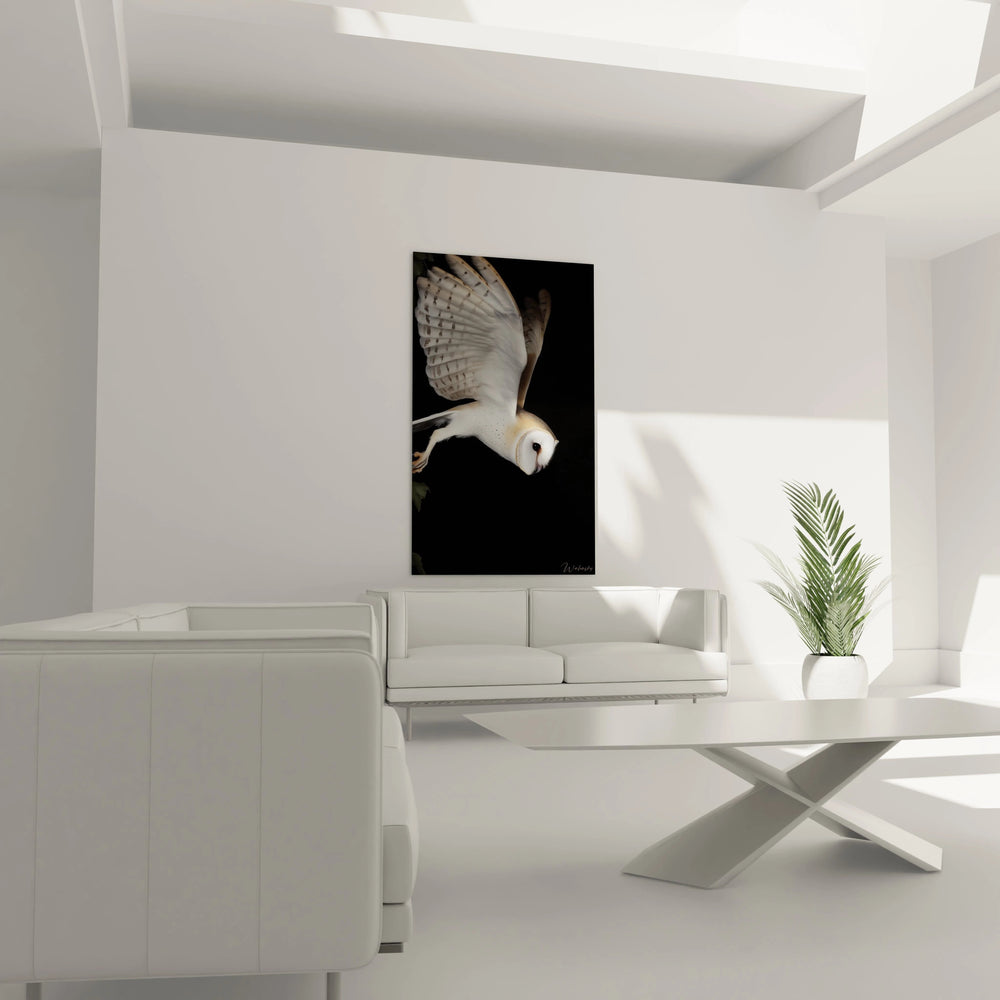 Cette tableau chouette murale se distingue par plusieurs éléments visuels distinctifs impossibles à reproduire. L'expression intense du regard, avec ses yeux noirs perçants, crée une connexion émotionnelle immédiate avec l'observateur. La position des ailes, figées dans un battement parfait, traduit à la fois la puissance et la grâce du vol. Les détails microscopiques des plumes, notamment les mouchetures caractéristiques de l'effraie, sont rendus avec une fidélité remarquable. Cette œuvre chouette décorative capture un instant fugace de la nature avec une intensité dramatique qui la rend totalement unique dans l'univers de l'art animalier contemporain.