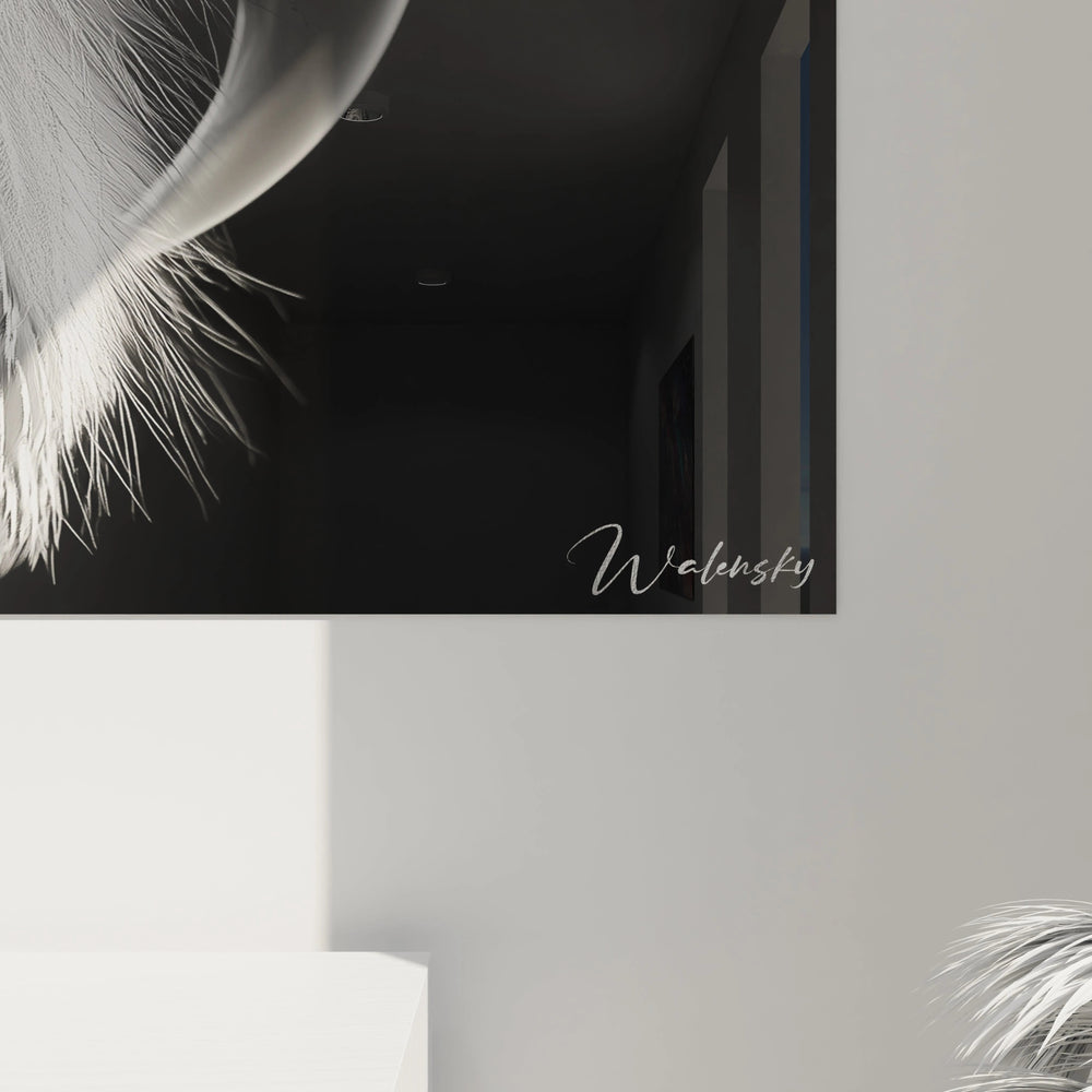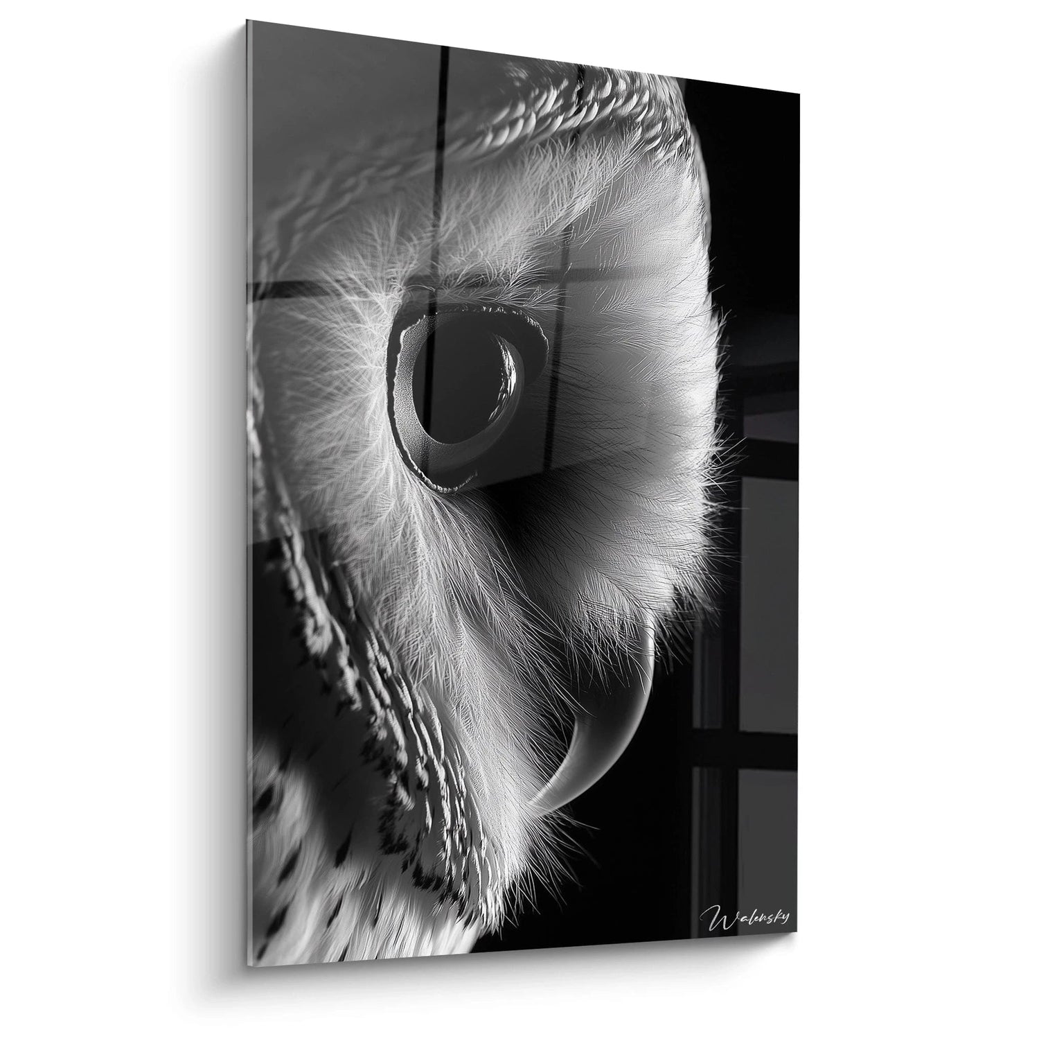 Les textures visibles dans cette art mural chouette révèlent un travail méticuleux sur les détails. Chaque plume individuelle semble palpable, créant un effet quasi-tactile remarquable. Les surfaces présentent différentes qualités :
