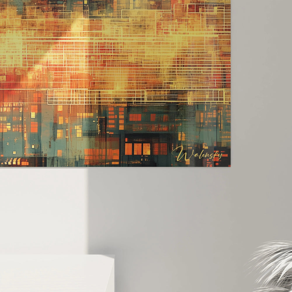 Ce tableau phonographe captive instantanément par sa composition panoramique mettant en vedette un gramophone rétro sur fond numérique éclatant. L'œuvre frappe par son mélange audacieux d'esthétique steampunk et d'art digital contemporain. Le phonographe ancien, avec son pavillon cuivré qui projette une lumière orangée intense, se détache magistralement contre un arrière-plan fragmenté de pixels rouges, oranges et verts profonds qui évoquent une matrice urbaine nocturne illuminée.