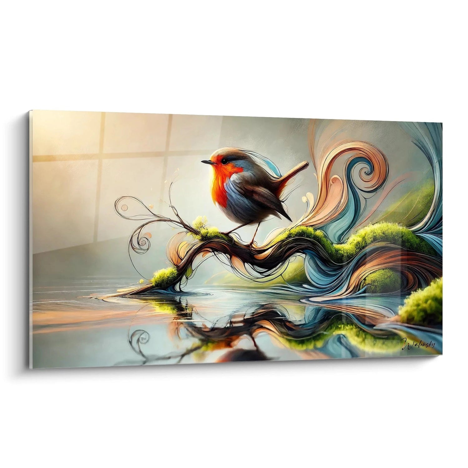 Grâce à ses courbes fluides et ses couleurs vibrantes, ce tableau invite à une expérience visuelle unique. La texture douce que l’on devine dans le plumage minutieusement représenté du rouge-gorge vous transporte immédiatement dans un univers apaisant. Les volutes des branches sinueuses et les reflets chaleureux de l’eau créent une atmosphère presque magique, où chaque regard découvre de nouveaux détails, comme un souffle de vie qui illumine votre intérieur.