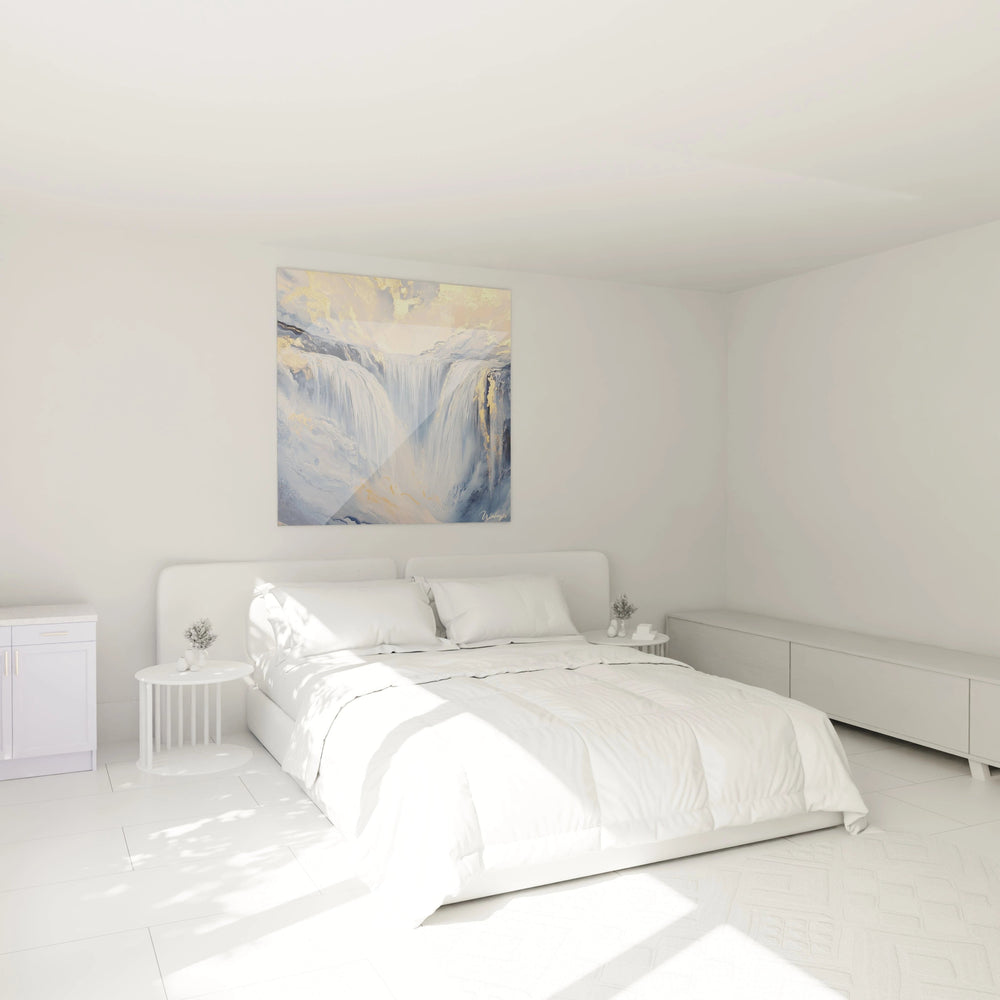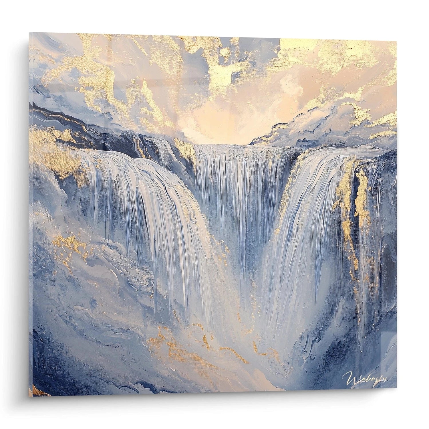 Chaque coup de pinceau révèle ce flux perpétuel d’eau, délicatement modelé pour restituer une sensation de mouvement vivant. La palette mêle des bleus profonds, des blancs éclatants et des touches d’or scintillant, évoquant la pureté de la nature et la chaleur de la lumière qui s’y reflète. En contemplant cette œuvre, vous plongez instantanément dans un univers où le temps semble suspendu, où la cascade devient un symbole de renouveau et de sérénité.