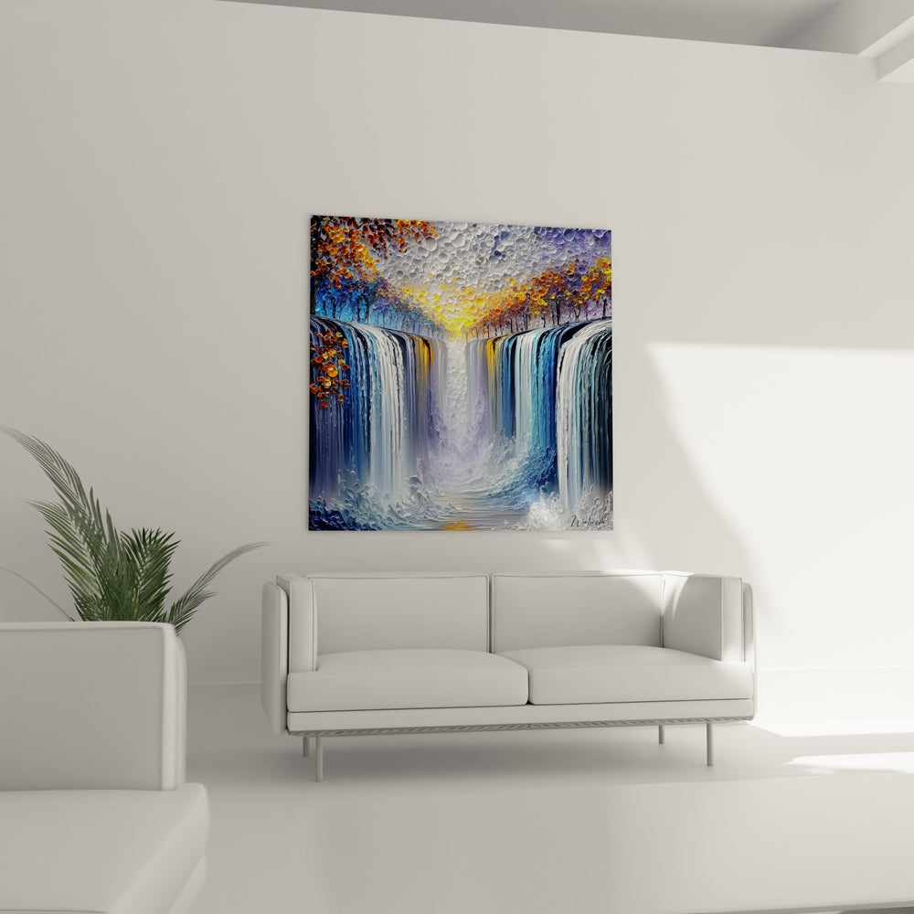 Tags : cascade jumelle, chutes d'eau automne, tableau relief 3D, art mural nature, peinture cascade moderne