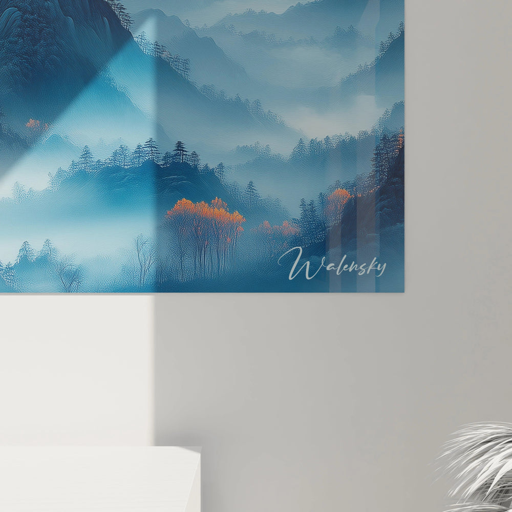 Les détails qui distinguent vraiment cette œuvre montagne incluent la façon dont les brumes semblent réellement flotter entre les vallées, créant des poches de mystère. La gradation subtile des bleus montagneux, du presque noir au bleu pâle, démontre une compréhension profonde de la perspective atmosphérique. Ce art mural montagne se distingue également par l'absence totale d'éléments humains, offrant une vision pure et intemporelle de la nature sauvage.