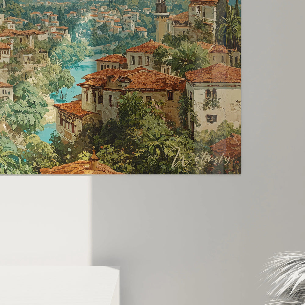 La composition de ce tableau mosquée terrasses étagées suit une organisation pyramidale savamment orchestrée. La mosquée principale occupe le tiers supérieur gauche, ses coupoles dorées créant un contraste saisissant avec le ciel turquoise. L'artiste a disposé les habitations en cascades descendantes, formant des terrasses naturelles qui guident l'œil vers la vallée luxuriante. Cette œuvre architecture orientale utilise la perspective aérienne pour créer une profondeur remarquable, chaque plan architectural se détachant nettement du suivant. Les lignes de fuite convergent vers l'horizon maritime, créant un effet de grandeur panoramique. La végétation luxuriante, représentée par des palmiers et cyprès stratégiquement placés, ponctue la composition et adoucit la géométrie rigoureuse de l'architecture.