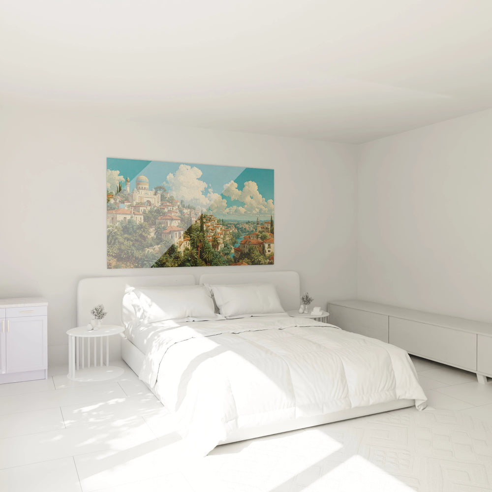 L'examen approfondi de ce tableau mosquée ornements dorés révèle une virtuosité technique remarquable dans le traitement des textures. Les coupoles présentent des reflets métalliques subtils, suggérant l'éclat de la céramique émaillée traditionnelle. Les murs de pierre des habitations montrent des variations tonales délicates, créant l'illusion de matériaux vieillis par le temps. La végétation bénéficie d'un traitement particulièrement soigné : chaque fronde de palmier semble individuellement modelée, créant des jeux d'ombre et de lumière naturels. Cette décoration murale architecture islamique démontre une connaissance approfondie des techniques de perspective atmosphérique, les détails s'estompant progressivement vers l'horizon. Les effets de lumière méditerranéenne baignent l'ensemble d'une clarté dorée caractéristique des paysages orientaux idéalisés.