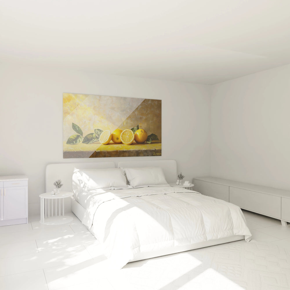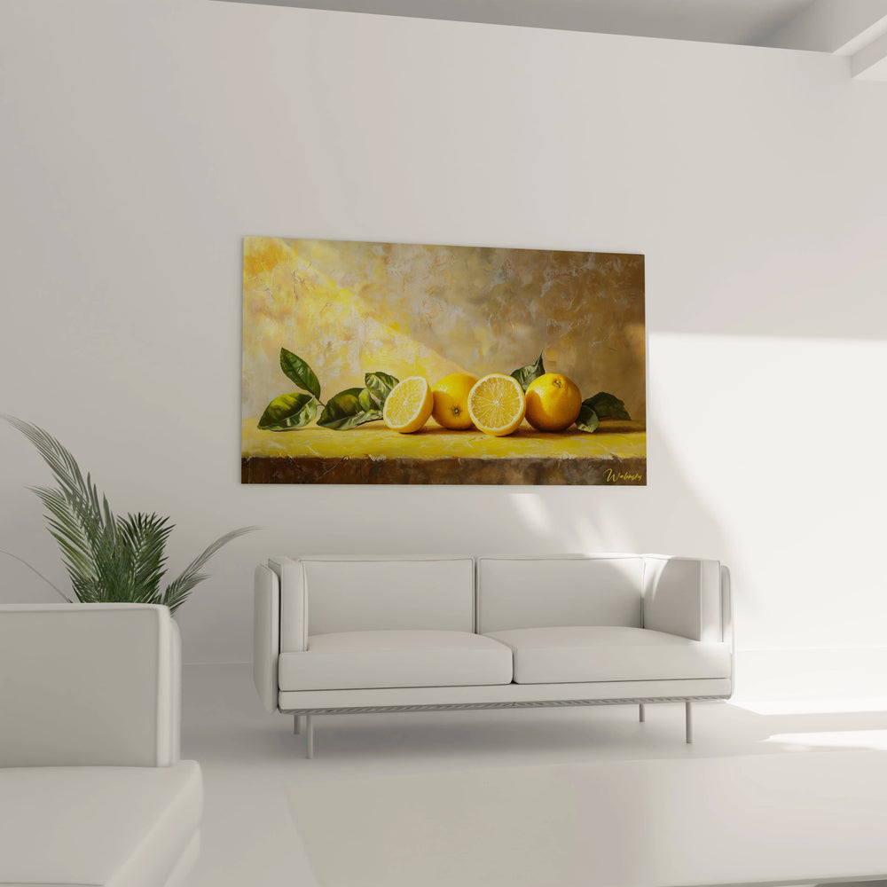 Chaque dĂ©tail de ce tableau est une cĂ©lĂ©bration de la simplicitĂ© et de lâharmonie naturelle. La lumiĂšre dorĂ©e met en valeur la texture vibrante du citron, son Ă©clat juteux et la richesse des verts profonds des feuilles, crĂ©ant une sensation immĂ©diate de puretĂ© et de renouveau. Pendues sur un mur, ces nuances chaudes et lumineuses insufflent un air frais et dynamisent subtilement votre piĂšce.