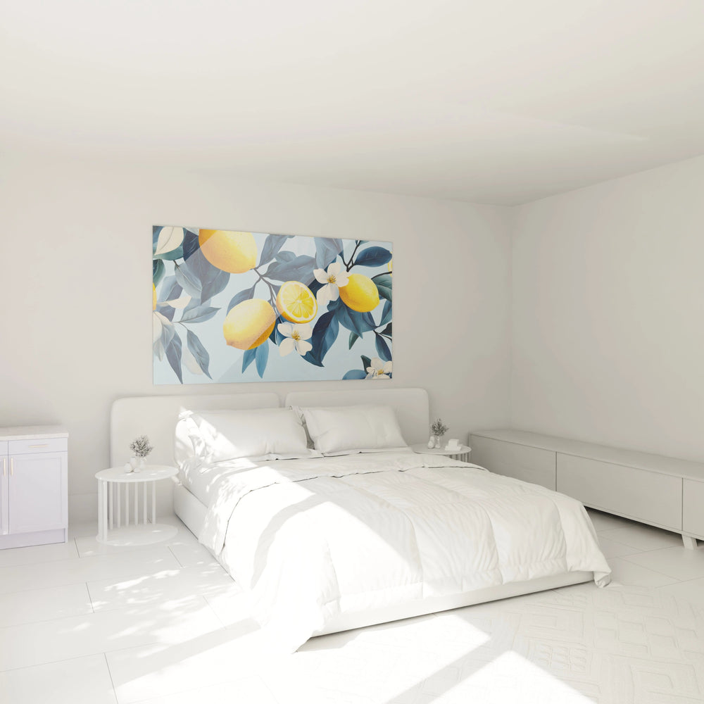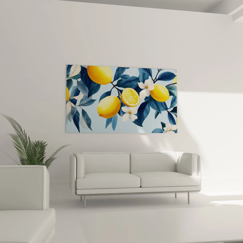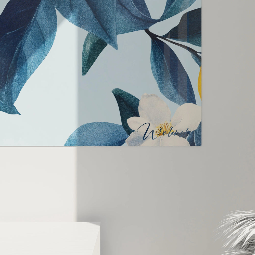 En contemplant ce tableau, vous vous immergez dans un jardin où chaque détail raconte une histoire. Les citrons, brillants et texturés, illuminent la scène de leur jaune solaire, réveillant vos sens et apportant une note de joie lumineuse. Les fleurs blanches, délicates et pures, semblent flotter au rythme d’une brise légère, tandis que le feuillage stylisé enveloppe le tout d’une atmosphère apaisante. Cette palette de jaune, bleu et blanc crée un équilibre visuel rare, invitant à la détente et à l’évasion.