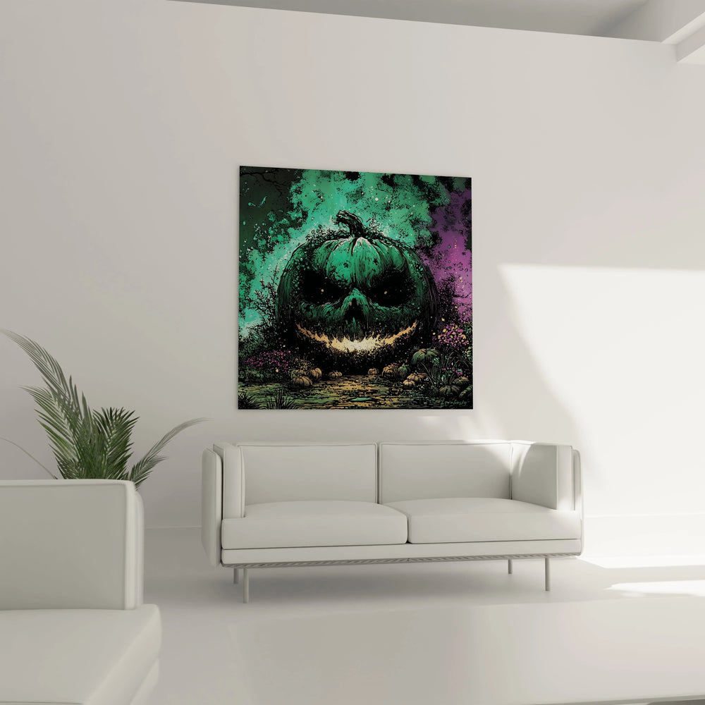 L'originalité de cette œuvre réside dans sa capacité à transformer un symbole classique d'Halloween en création artistique contemporaine. Le traitement chromatique non-conventionnel, privilégiant les verts et violets aux oranges traditionnels, crée une identité visuelle distinctive. L'expression faciale de la citrouille, avec ses yeux triangulaires perçants et son sourire dentelé asymétrique, évoque une personnalité propre et mémorable. Les projections colorées qui l'entourent forment une aura presque magique, renforçant l'aspect surnaturel. Cette décoration murale citrouille originale se distingue par son approche moderne d'un thème classique, créant un pont entre tradition Halloween et art contemporain. L'intégration d'éléments du paysage - petites citrouilles, herbes stylisées - ancre la composition dans un univers cohérent et immersif.