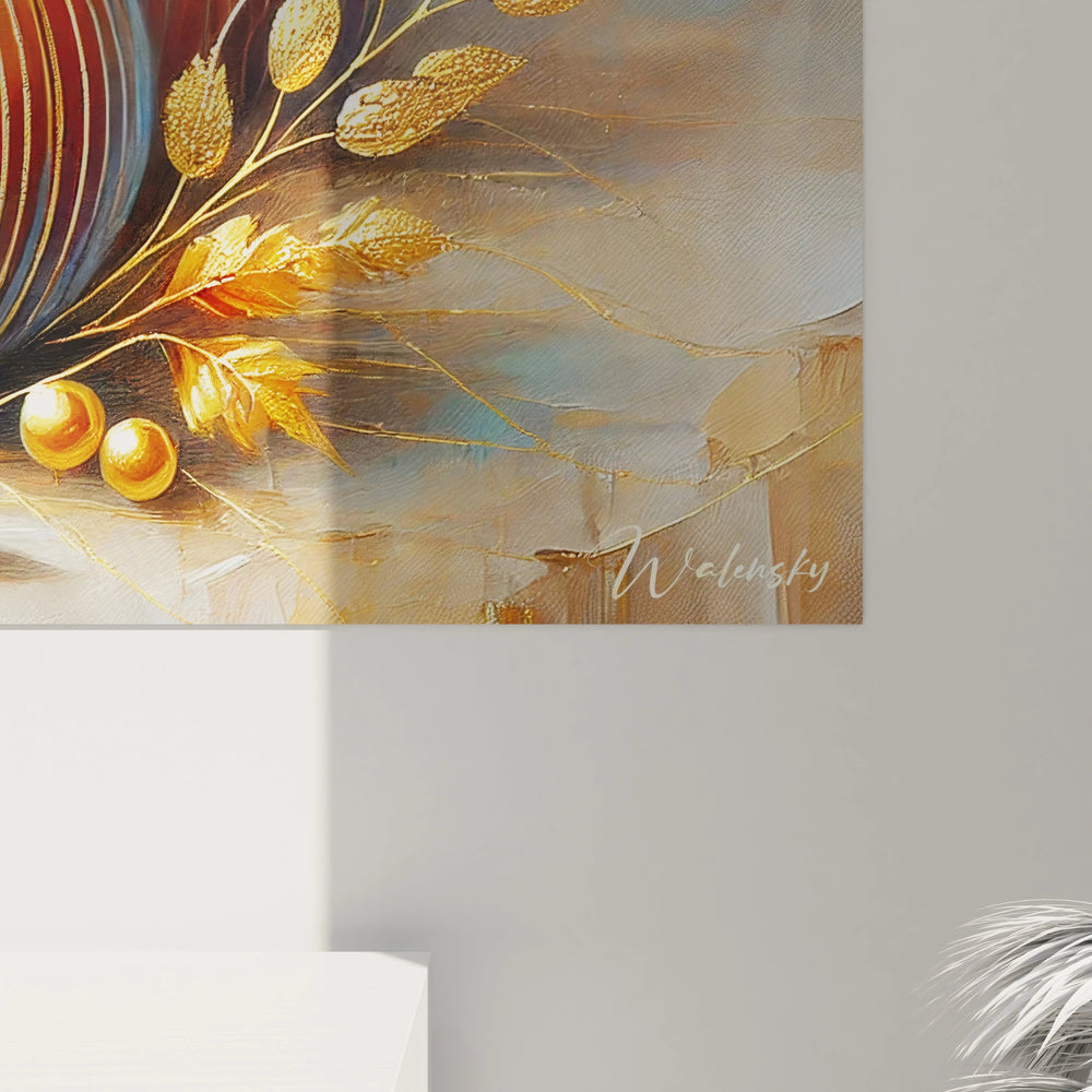 Chaque détail de ce tableau a été pensé pour capturer la chaleur lumineuse d’un après-midi d’automne : les citrouilles aux reflets dorés semblent presque vibrer sous une lumière ambrée, tandis que les touches beige apportent un équilibre subtil et apaisant. L’œuvre évoque naturellement les souvenirs enveloppants des moments partagés autour d’une table décorée avec soin, où se mêlent convivialité et élégance.