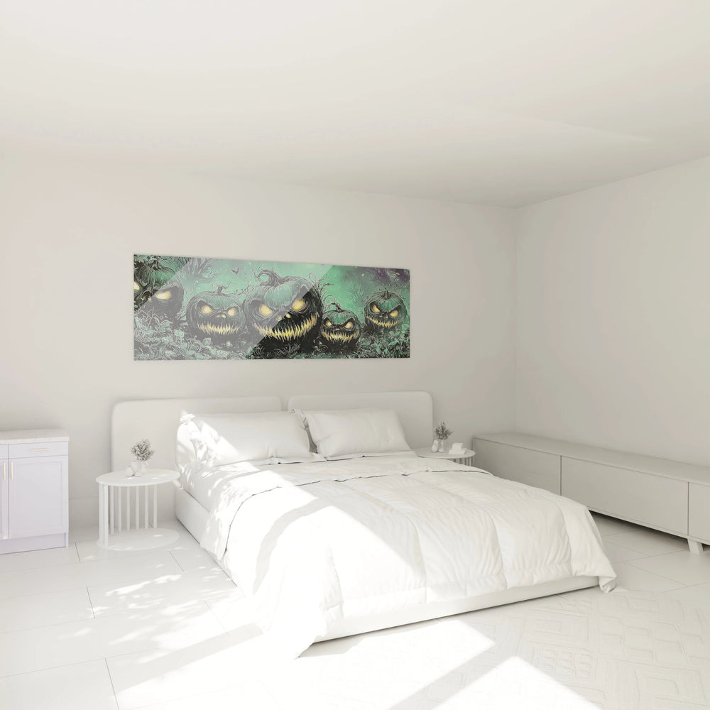 Ce tableau citrouilles présente une composition saisissante où des jack-o'-lanterns aux expressions malveillantes dominent un paysage verdoyant et mystérieux. L'œuvre révèle un groupe de citrouilles sculptées aux yeux dorés lumineux, disposées dans un environnement luxuriant de végétation émeraude. Chaque tableau citrouilles yeux dorés capture l'essence même d'Halloween avec ses sourires dentelés et ses regards hypnotiques. La première impression visuelle frappe par l'intensité des contrastes entre les teintes sombres des courges et l'éclat doré de leurs cavités oculaires. Cette décoration murale citrouilles se distingue immédiatement par son atmosphère à la fois enchanteresse et inquiétante.