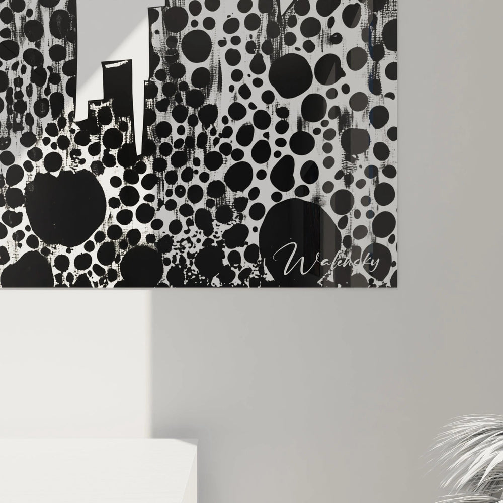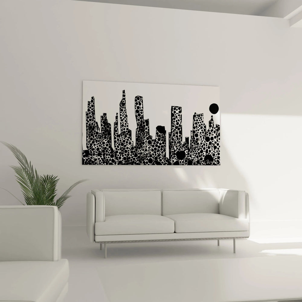 Ce tableau skyline urbain présente une silhouette de gratte-ciels stylisée dans un rendu monochrome saisissant. L'œuvre révèle immédiatement sa nature contemporaine à travers cette représentation de métropole où chaque bâtiment arbore un motif de cercles noirs de tailles variées sur fond blanc. Cette décoration murale skyline contemporain se distingue par sa texture visuelle unique qui évoque simultanément l'architecture moderne et l'art optique. Les formes géométriques des tours se dressent avec une présence imposante, créant un horizon urbain reconnaissable instantanément. L'aspect le plus frappant réside dans cette transformation de la silhouette urbaine classique en une composition artistique où chaque structure architecturale devient un élément décoratif à part entière.