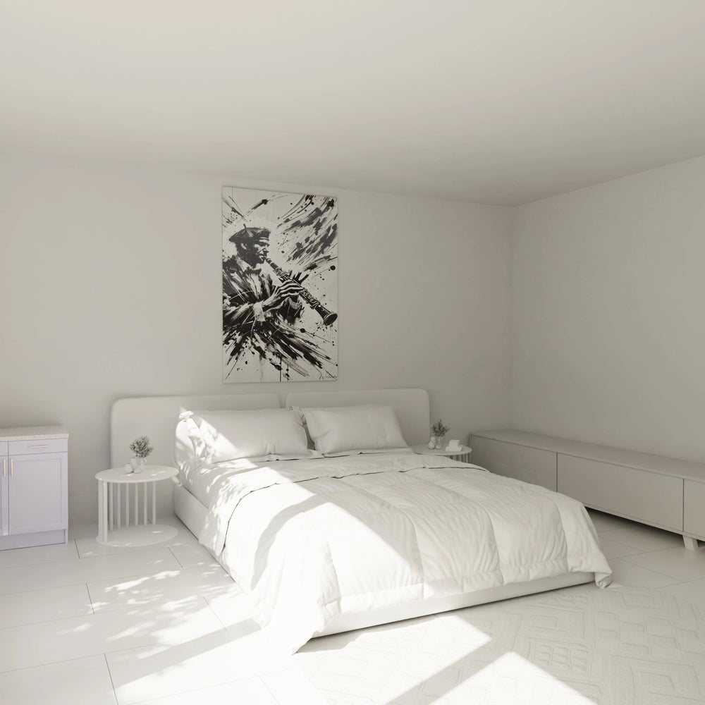 Ce tableau incarne l’instant magique d’un solo de clarinette improvisé. Chaque coup de pinceau épouse le rythme effervescent des notes qui s’envolent, traduisant la passion et la spontanéité d’un musicien absorbé par son art. Dans cette composition en noir, blanc et nuances de gris, vous percevez le contraste entre les silences délicats et les explosions sonores intenses, comme si la musique prenait forme devant vos yeux.