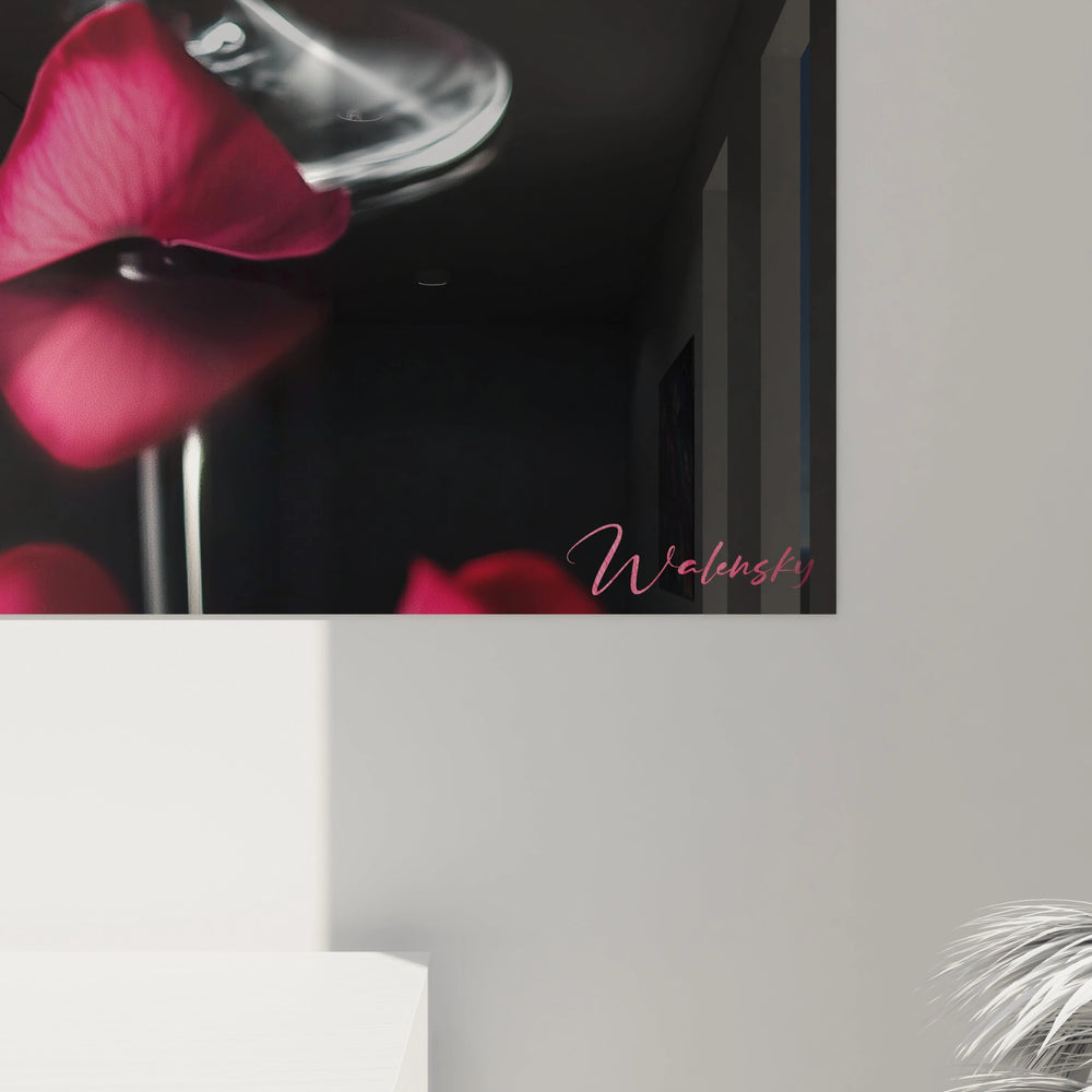 Le rouge profond et intense du cocktail évoque la passion et l'énergie, tandis que les nuances de noir apportent mystère et profondeur à l’ensemble. Les délicats pétales roses déposés à la surface du verre comme un parfum subtil ajoutent une touche de douceur et de délicatesse, adoucissant l’ensemble avec raffinement. Chaque détail, de la condensation scintillante aux ombres soigneusement travaillées, invite votre regard à s’égarer dans cette composition hypnotique, pleine de caractère et de vie.