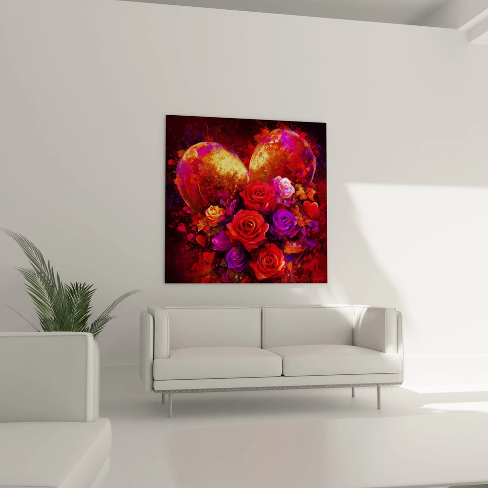 Ce tableau cœur révèle une composition artistique exceptionnelle où la passion s'exprime à travers un mélange saisissant de couleurs chaudes et vibrantes. L'œuvre présente un tableau cœur romantique d'une intensité remarquable, dominé par des teintes rouge écarlate, pourpre profond et violet mystérieux. Au centre de cette création artistique, un cœur lumineux irradie d'une lumière dorée, entouré de roses aux pétales soyeux qui semblent danser dans un tourbillon de couleurs. Cette décoration murale cœur capture l'essence même de l'amour passionné, créant une atmosphère envoûtante qui transforme instantanément l'espace où elle est exposée.