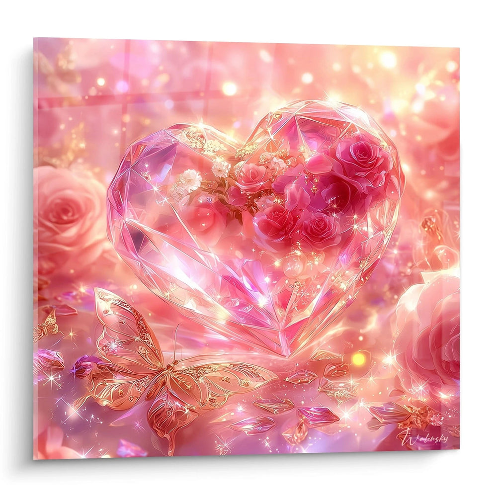 Cette œuvre d'art présente un tableau cœur cristal roses d'une beauté saisissante, où la transparence du cristal révèle un bouquet de roses délicates aux teintes rosées et dorées. Le tableau cœur romantique capture l'essence même de l'amour à travers sa forme de cœur parfaitement sculpté, empli de fleurs aux pétales vaporeux. L'effet de transparence cristalline crée une profondeur visuelle extraordinaire, où chaque rose semble flotter dans un écrin de lumière. Des papillons aux ailes ornementées viennent compléter cette composition féerique, ajoutant une dimension poétique à ce tableau cœur magique. L'arrière-plan scintillant d'étoiles dorées amplifie l'aspect enchanteur de l'ensemble.