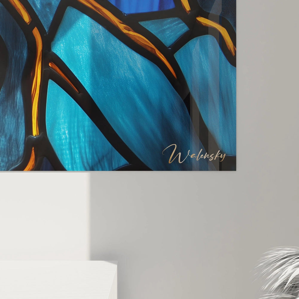 Chaque section délimitée par des lignes noires rappelle l’authenticité des vitraux traditionnels, tandis que les couleurs riches — bleu profond, rouge passion, et or divin — se superposent délicatement pour simuler la translucidité du verre. Cette technique crée une impression de profondeur et d’éclat, comme si une lumière intérieure émanait directement du tableau, enveloppant votre pièce d’une atmosphère apaisante et sacrée.