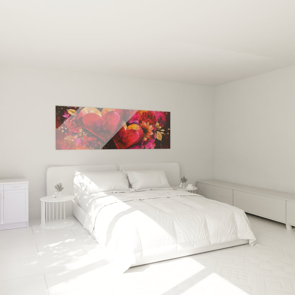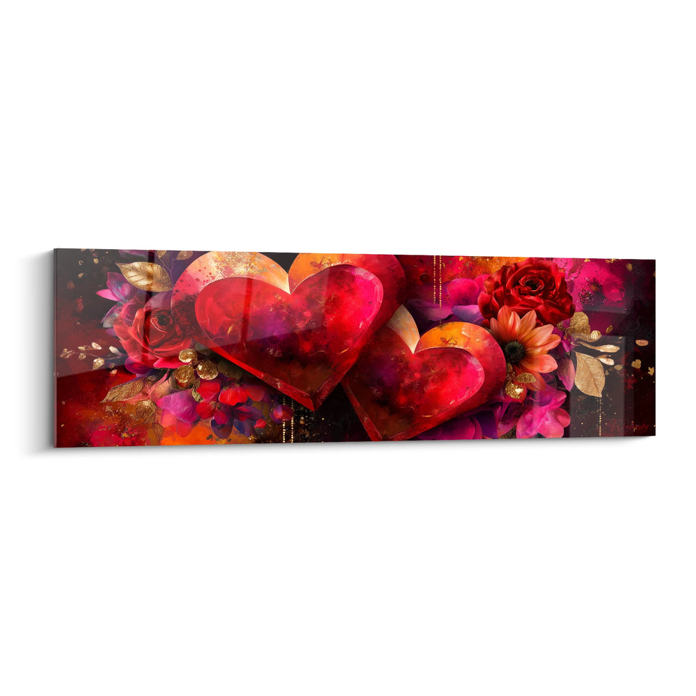 Ce tableau cœurs romantique présente une composition majestueuse où dominent deux cœurs cristallins translucides aux reflets rouge rubis. Cette décoration murale cœurs capture immédiatement l'attention par sa palette chromatique intense et sa richesse florale exceptionnelle. Les cœurs semblent sculptés dans un cristal précieux, créant des jeux de lumière fascinants qui transforment chaque angle de vue. L'ensemble évoque une symphonie visuelle où la passion se mélange à l'élégance, faisant de ce tableau cœurs passion une œuvre d'une intensité émotionnelle remarquable. Les détails dorés parsemés à travers la composition ajoutent une dimension luxueuse qui élève cette art mural cœurs au rang d'œuvre d'exception.