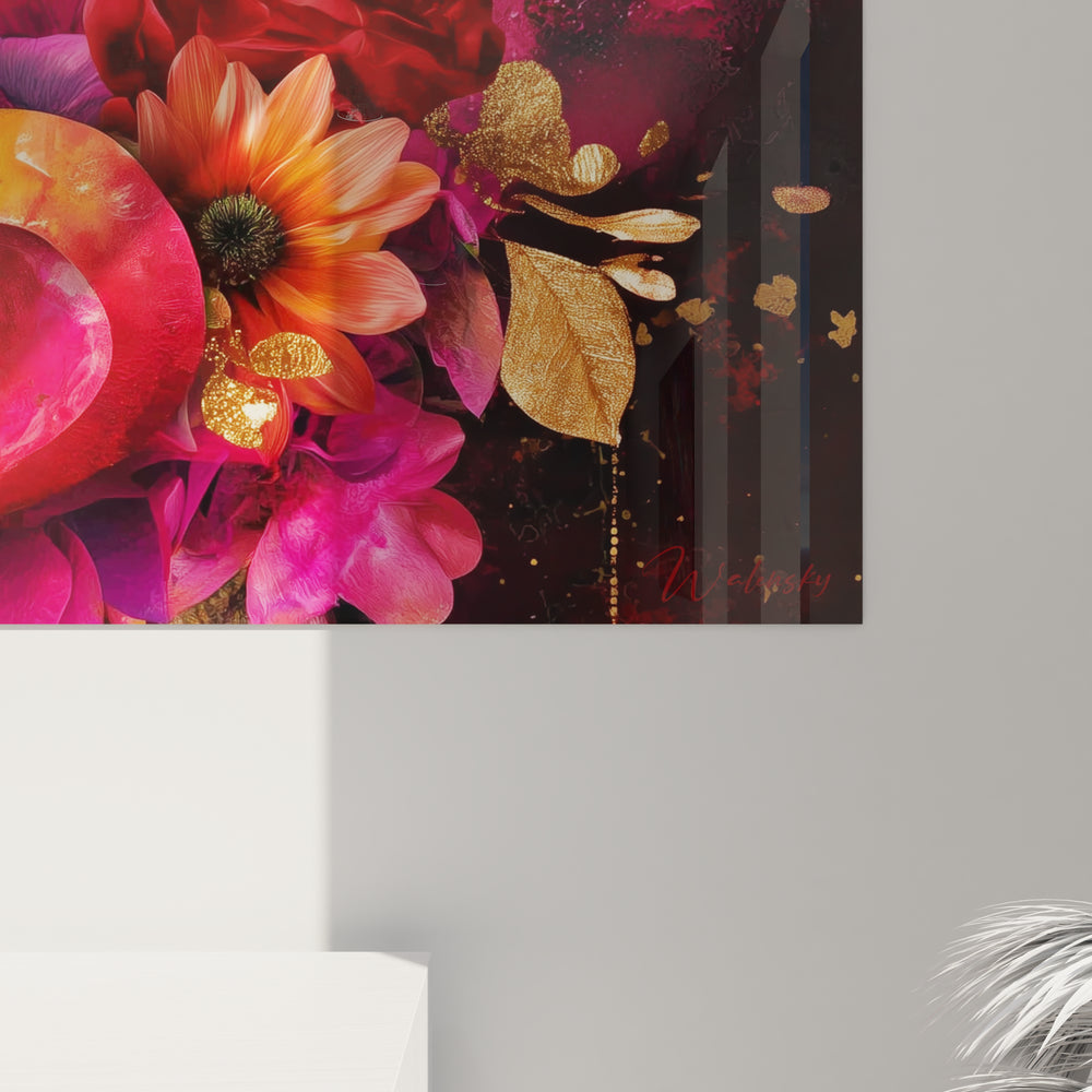La composition de cette œuvre cœurs suit un équilibre asymétrique sophistiqué où les deux cœurs principaux occupent le centre gauche de l'espace. Cette disposition crée un mouvement naturel de lecture qui guide l'œil vers les éléments floraux environnants. Les roses rouge profond et les fleurs aux teintes orange et fuchsia forment un écrin luxuriant autour des cœurs translucides. La perspective légèrement plongeante permet d'apprécier la tridimensionnalité des éléments, particulièrement visible sur les surfaces réfléchissantes des cœurs. L'utilisation de l'espace négatif entre les éléments crée des respirations visuelles qui évitent la surcharge tout en maintenant une richesse décorative constante. Cette décoration murale cœurs démontre une maîtrise parfaite de l'équilibre entre densité visuelle et lisibilité artistique.