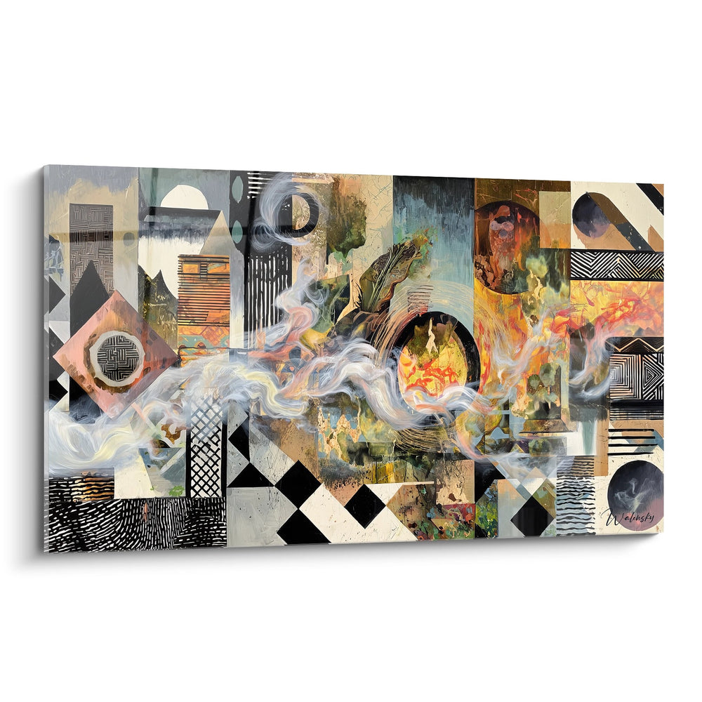 Ce tableau mural collage géométrique présente une composition fascinante qui transcende les frontières du surréalisme abstrait. L'œuvre révèle un assemblage complexe de formes géométriques, de textures variées et d'éléments organiques qui s'entremêlent dans un chaos organisé saisissant. La toile surréaliste abstraite dévoile des motifs rayés en noir et blanc qui contrastent avec des zones colorées aux tons chauds d'orange, de rouge et de jaune. Des cercles, des losanges et des carrés se superposent à des éléments plus fluides, créant une tension visuelle captivante. Cette peinture géométrique moderne intègre des fragments qui évoquent des paysages, des textures minérales et des formes architecturales. Les jeux de transparence et d'opacité ajoutent une profondeur remarquable à cette œuvre d'art contemporaine. L'ensemble compose un tableau décoratif abstrait où chaque élément dialogue avec les autres, formant une symphonie visuelle complexe. Cette composition artistique murale révèle de nouveaux détails à chaque observation, invitant le regard à explorer ses multiples strates de signification et ses références visuelles diversifiées.