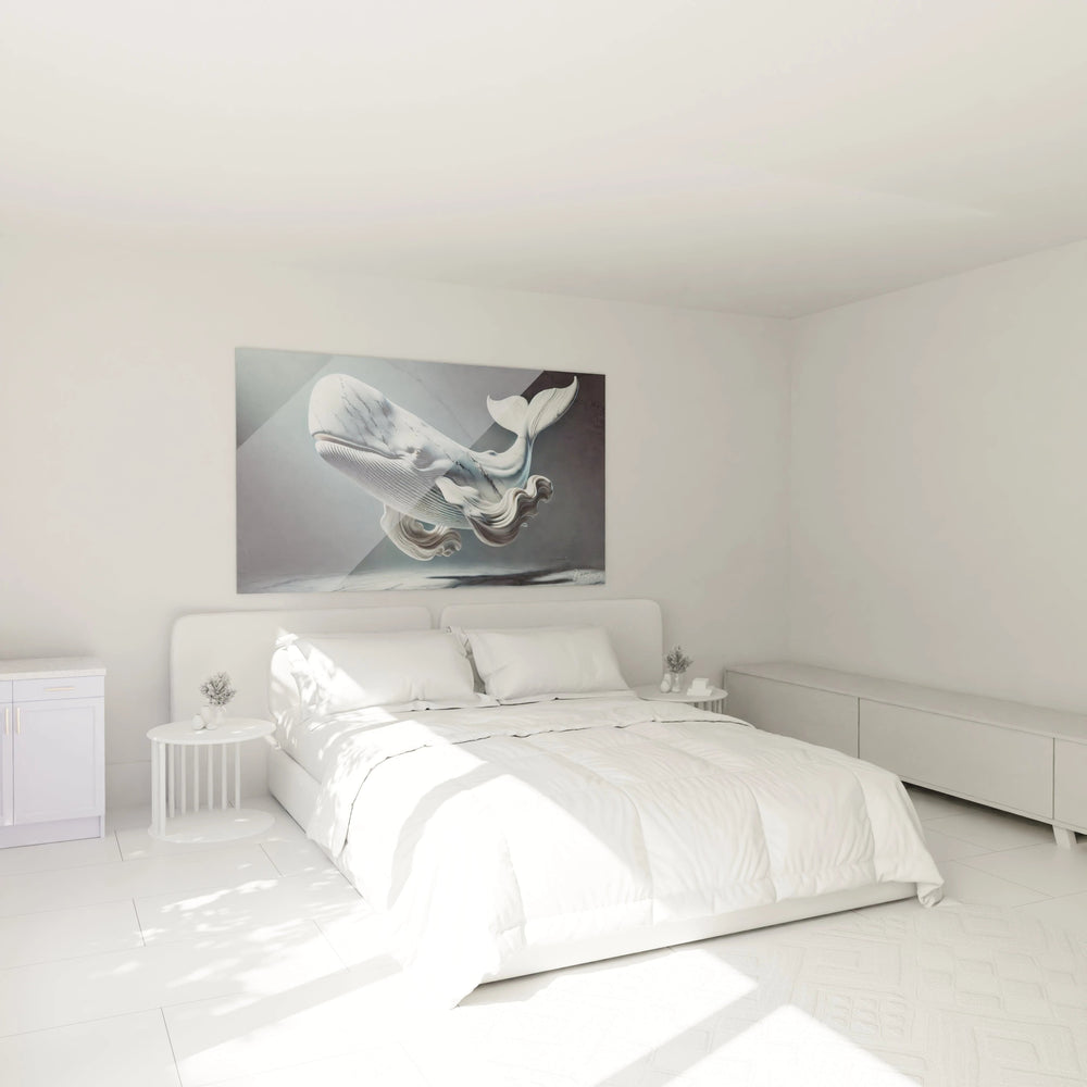 Ce tableau sublime capte la majesté imposante du cachalot, cette créature majestueuse symbole de puissance paisible. Sculpté dans un marbre aux veinures délicates, l’œuvre révèle une beauté immuable, presque mystique. Les nuances de blanc, gris et argent s’entrelacent avec harmonie, évoquant la douce lumière filtrée sous la surface des mers calmes. La matière noble du marbre se fait tactile, invitant à caresser du regard chaque détail, chaque reflet.