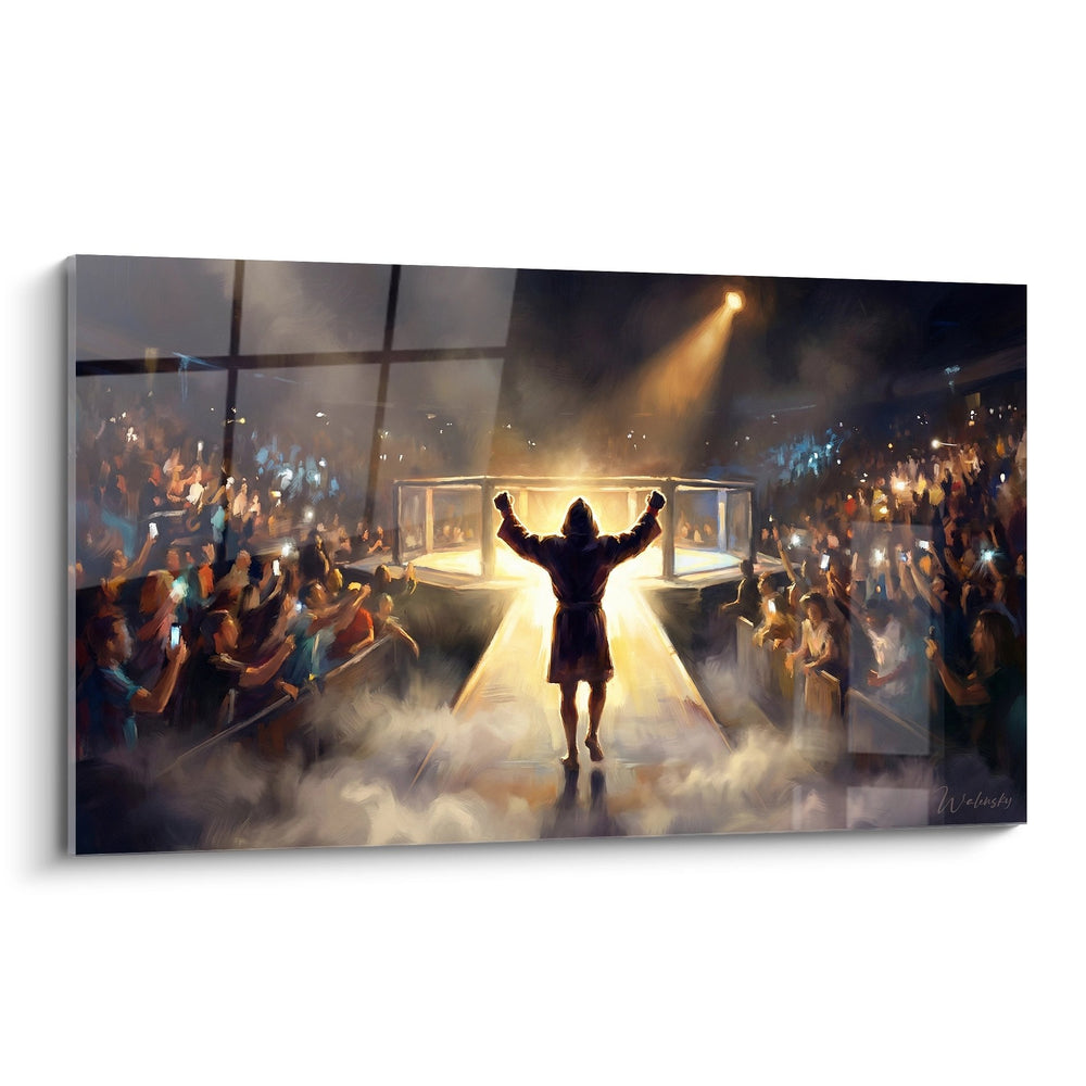 Ce tableau MMA capture l'instant magique de l'entrée d'un champion dans l'octogone, baigné par les projecteurs et acclamé par une foule en délire. La silhouette du combattant, bras levés en signe de victoire, se dresse fièrement au centre de la cage octogonale, créant une composition dramatique saisissante. L'ambiance électrique de l'arène est parfaitement retranscrite à travers les jeux de lumière dorée qui illuminent la scène, contrastant avec l'obscurité environnante. Les spectateurs, représentés dans un flou artistique maîtrisé, transmettent l'énergie brute et l'excitation palpable qui caractérisent les grands événements de MMA. Cette œuvre d'art combat sublime l'essence même des arts martiaux mixtes : le courage, la détermination et la recherche de l'excellence. Le style pictural moderne apporte une dimension artistique raffinée à l'univers parfois brutal du MMA, transformant un moment sportif en véritable chef-d'œuvre visuel.