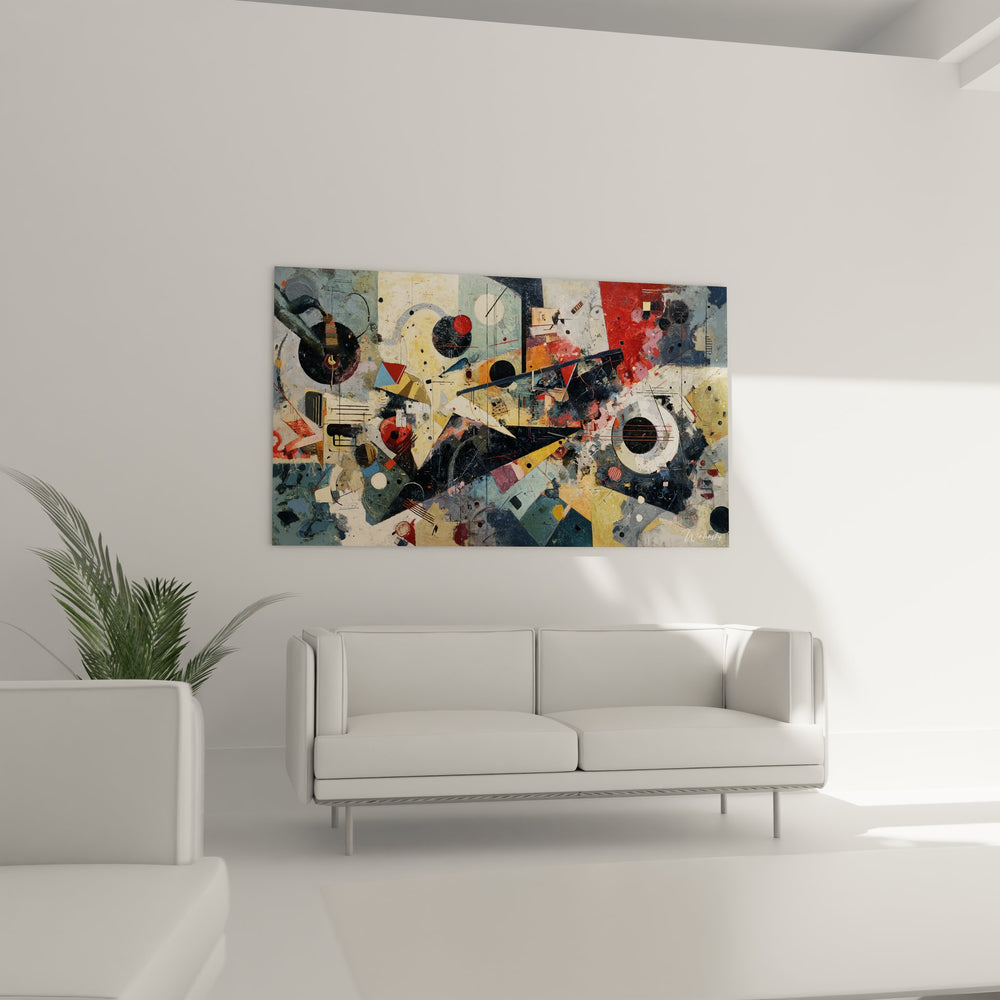 Tags : tableau abstrait géométrique, art mural moderne, composition dynamique, décoration contemporaine, abstraction colorée