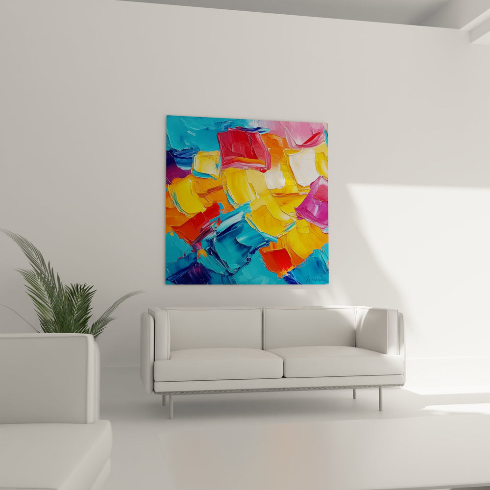 Ce tableau mural abstrait présente une explosion de couleurs vibrantes qui transforme l'espace en véritable galerie d'art contemporain. La peinture abstraite moderne se compose de formes géométriques aux teintes éclatantes : bleu turquoise, jaune solaire, rouge vermillon, orange intense et violet profond. Ces couleurs vives sur toile créent un dynamisme visuel saisissant grâce aux empâtements généreux qui donnent relief et texture à l'œuvre. L'artiste a appliqué la technique de l'impasto, où chaque coup de pinceau reste visible et apporte une dimension tactile unique à cette décoration murale contemporaine. Les formes cubiques et rectangulaires s'entremêlent dans une composition géométrique abstraite qui évoque à la fois la spontanéité du geste artistique et la structure réfléchie de l'art moderne. Cette œuvre d'art abstraite capture parfaitement l'essence du mouvement expressionniste abstrait, où l'émotion prime sur la représentation figurative. Les transitions chromatiques fluides entre les différentes zones colorées créent un rythme visuel captivant qui invite le regard à explorer chaque détail de cette peinture murale moderne.