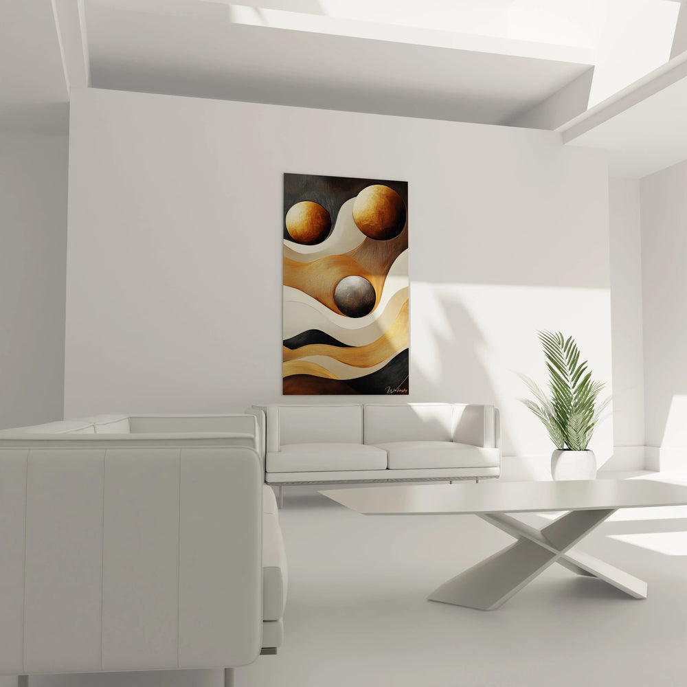 La composition s'organise selon un équilibre asymétrique savamment orchestré, où chaque élément trouve sa place dans un ensemble cohérent. Les trois sphères se positionnent stratégiquement : deux dans la partie supérieure créent un dialogue visuel, tandis que la troisième, placée plus bas, ancre la composition. Cette décoration murale géométrique utilise la règle des tiers de manière subtile. Les courbes serpentines créent des lignes directrices qui guident l'œil à travers l'œuvre, établissant un parcours visuel fluide. L'espace négatif est exploité avec intelligence, permettant à chaque élément de respirer. Cette structuration fait de ce tableau abstrait moderne design une œuvre parfaitement équilibrée malgré son apparente complexité compositionnelle.