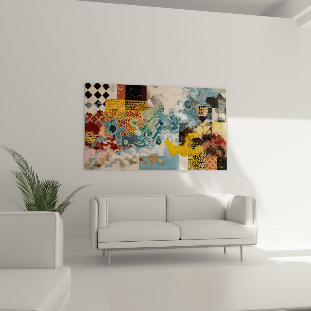 Ce tableau mural composition géométrique présente une fascinante mosaïque de fragments colorés qui s'entremêlent dans un équilibre parfait entre ordre et chaos. L'œuvre révèle une composition abstraite moderne où se côtoient motifs géométriques rigides et formes organiques fluides. Les damiers noir et blanc apportent une structure classique tandis que les volutes bleues et turquoise créent un mouvement dynamique à travers la toile. Cette peinture abstraite géométrique intègre des éléments décoratifs inspirés de l'art islamique avec ses entrelacs dorés complexes, créant un dialogue entre traditions artistiques orientales et modernité occidentale. Les textures variées - du lisse au granuleux, du mat au brillant - confèrent à ce tableau décoratif abstrait une richesse tactile remarquable. Chaque section de la composition raconte sa propre histoire tout en participant à l'harmonie générale de l'ensemble. Cette œuvre d'art contemporaine transforme l'espace en galerie personnelle, invitant le regard à explorer chaque détail de cette création artistique moderne aux multiples lectures possibles.