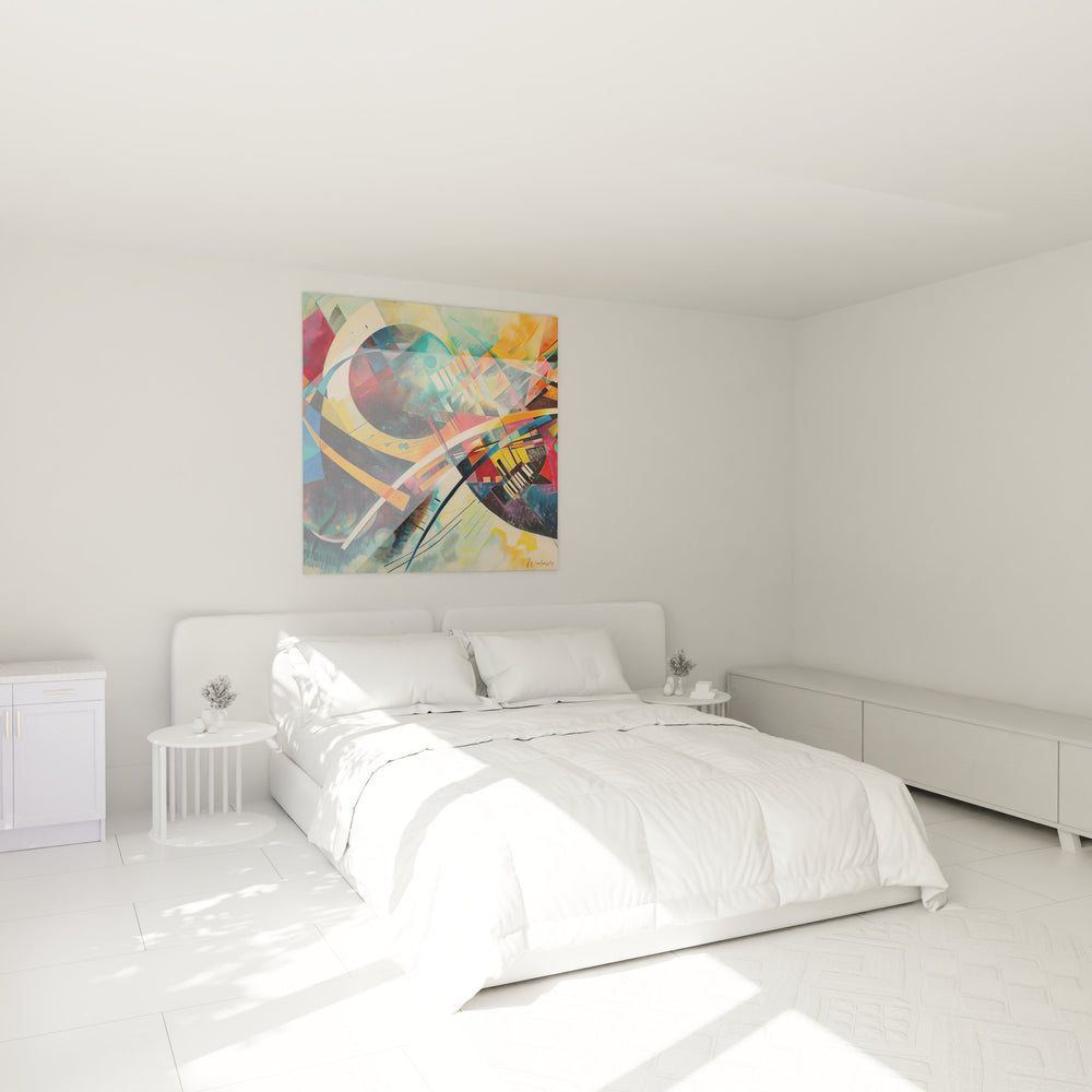 Cette composition s'inspire des maîtres de l'abstraction géométrique comme Kandinsky et Klee, tout en apportant une vision contemporaine unique. L'œuvre fait écho aux recherches artistiques sur la composition géométrique décorative du début du XXe siècle, réinterprétées avec une sensibilité moderne. Cette toile abstraite design s'inscrit dans la continuité des mouvements avant-gardistes tout en proposant une esthétique résolument actuelle.